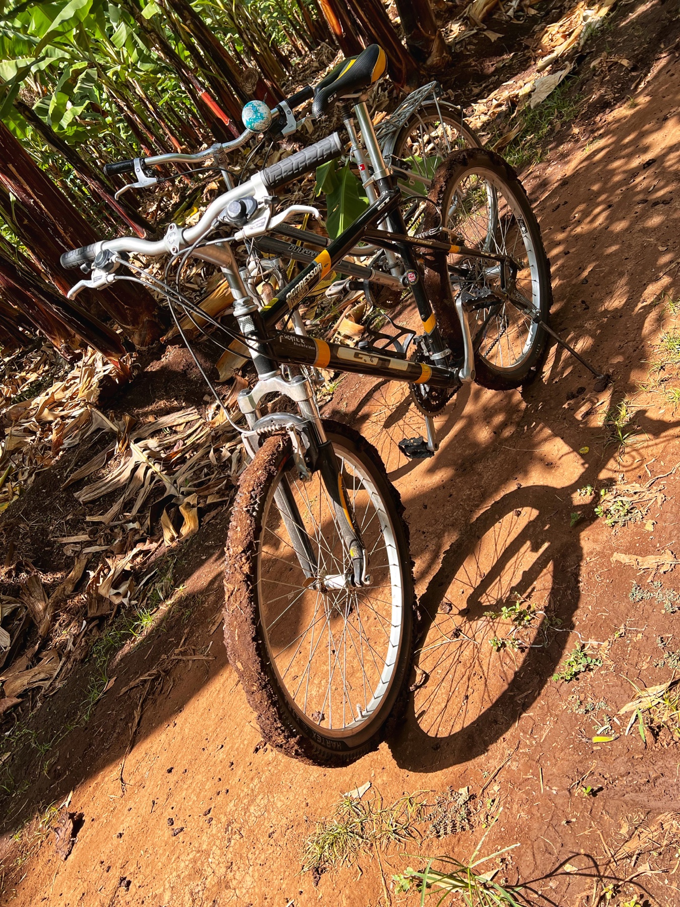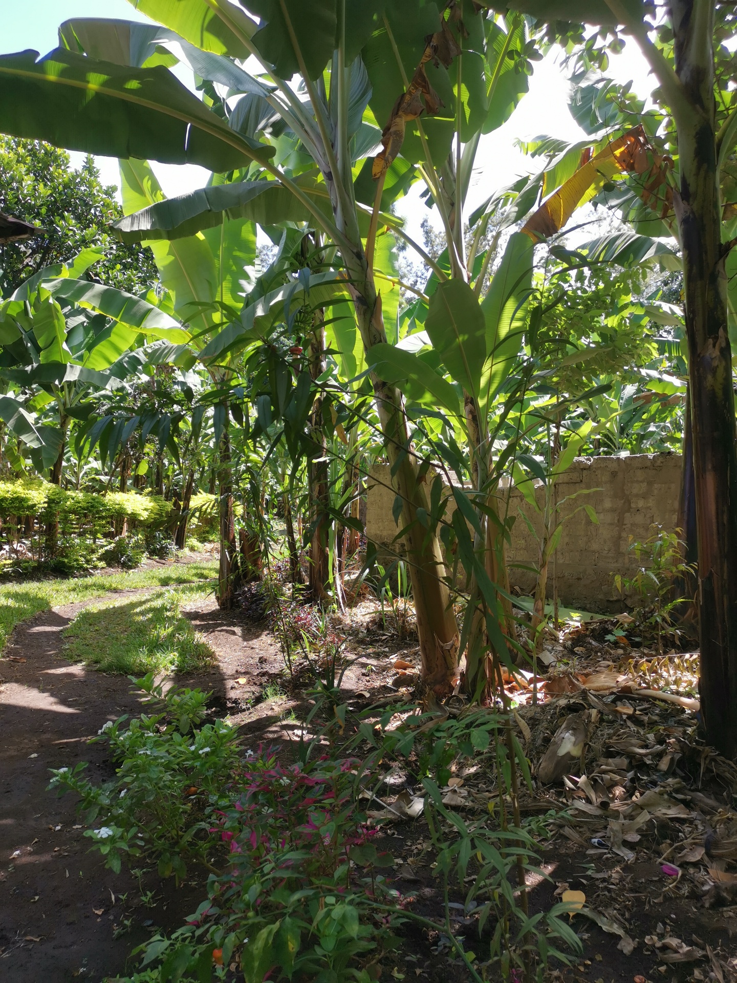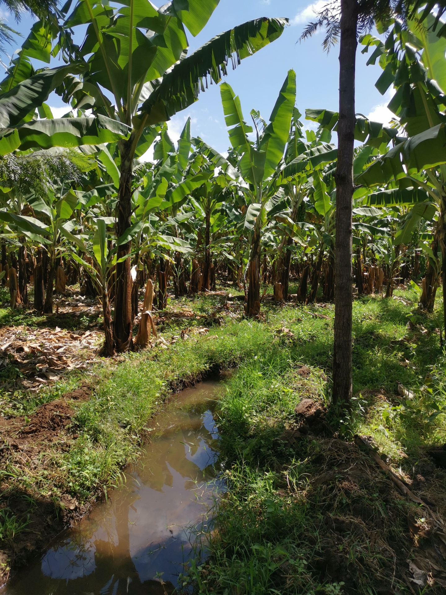 Auf dem Rückweg wollte Josef eine Abkürzung nehmen, wo wir einen Fluss überqueren mussten. Leider war die Brücke nicht mehr da, so dass wir einen Umweg gehen mussten mitten durch die Bananenplantagen.