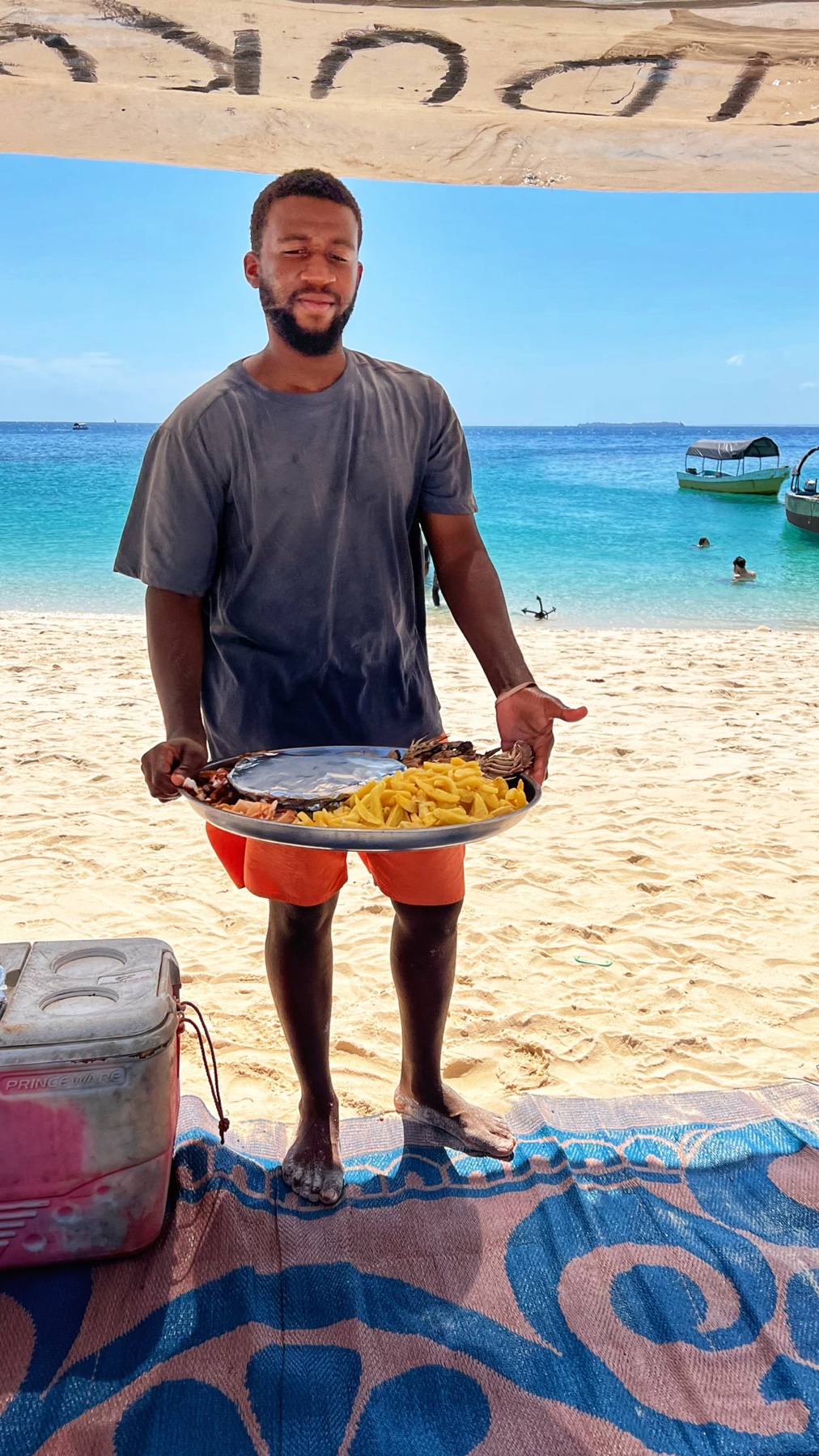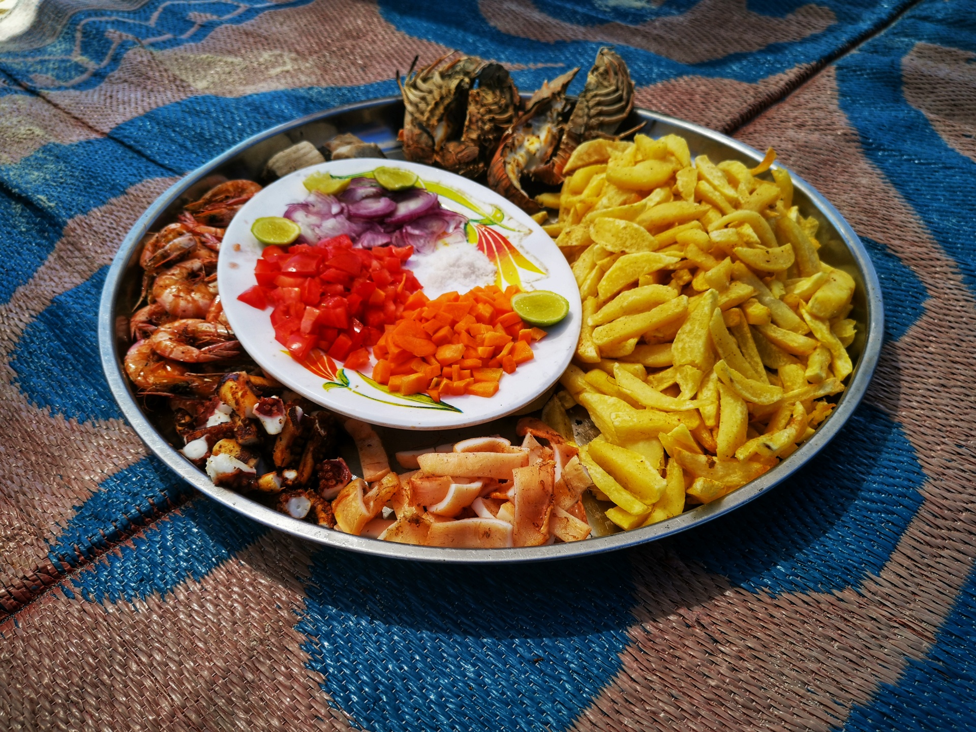 Danach wurden wir von den Männern vom Boot mit frischen Früchten und einem direkt am Strand zubereiteten Essen verwöhnt. Verschiedene Meeresfrüchte wie Hummer, Tintenfisch, Octopus und Garnelen konnten wir probieren. Sehr lecker!