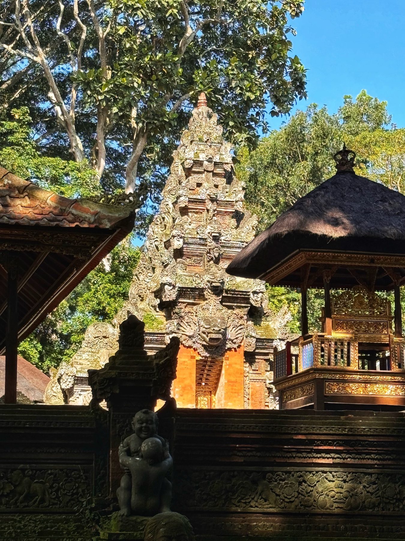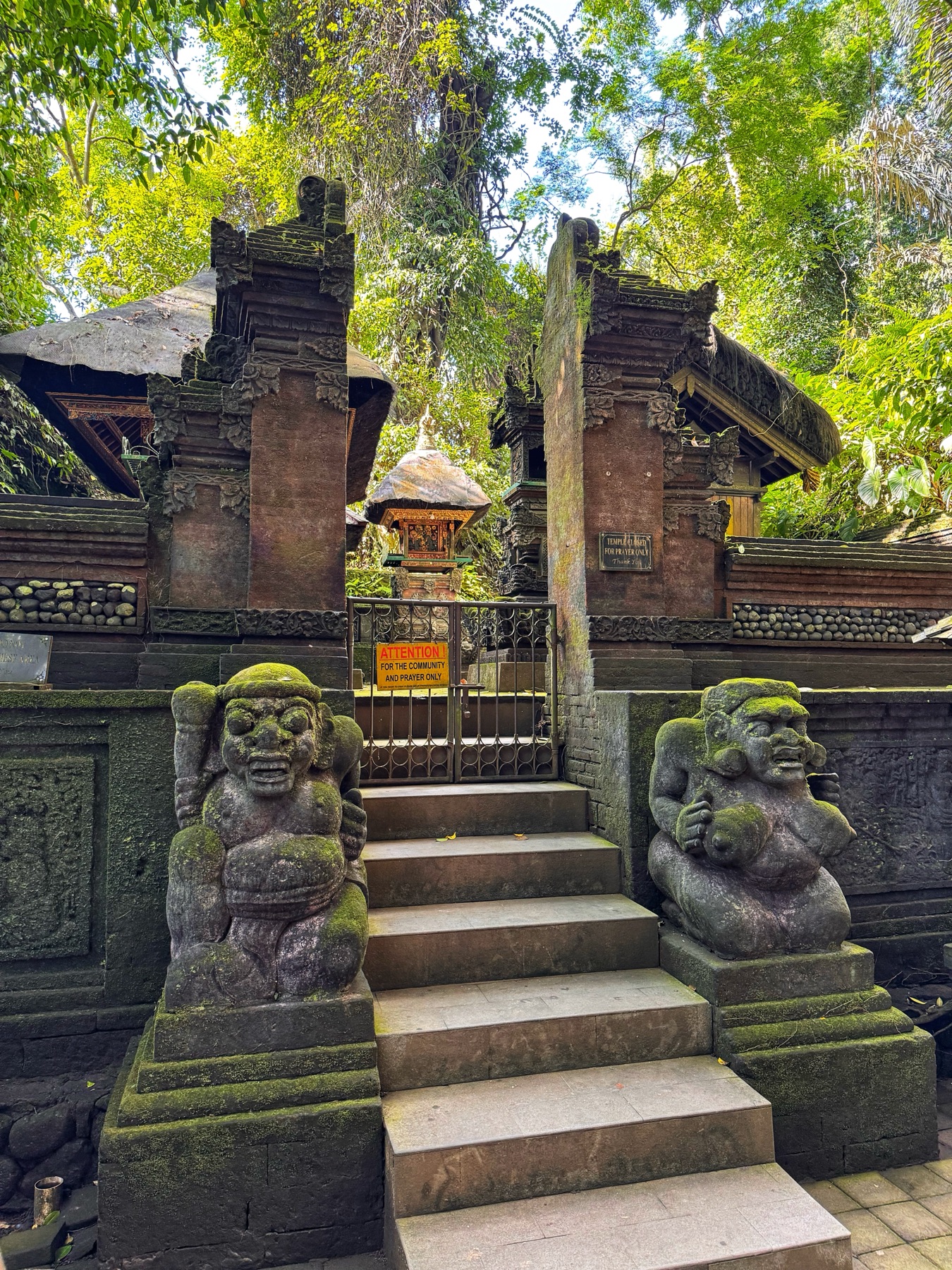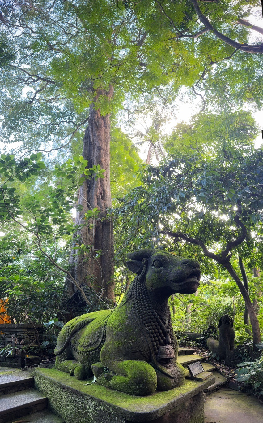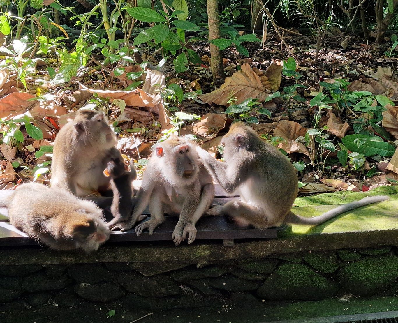 Zurück zum Hotel blieb noch genug Zeit für eine weitere Entdeckung. Zu einem Besuch in Ubud gehört auf jeden Fall auch ein Abstecher in den Affenwald. Praktischerweise ist der Eintritt nur 5 Minuten zu Fuß von unserer Unterkunft entfernt. Es handelt sich hierbei um einen kleinen Naturpark mit mehreren hinduistischen Tempeln eingebettet im Urwald. Und überall laufen kleine und große Makaken-Affen rum. Sehr lustig ihnen beim Spielen zuzusehen.