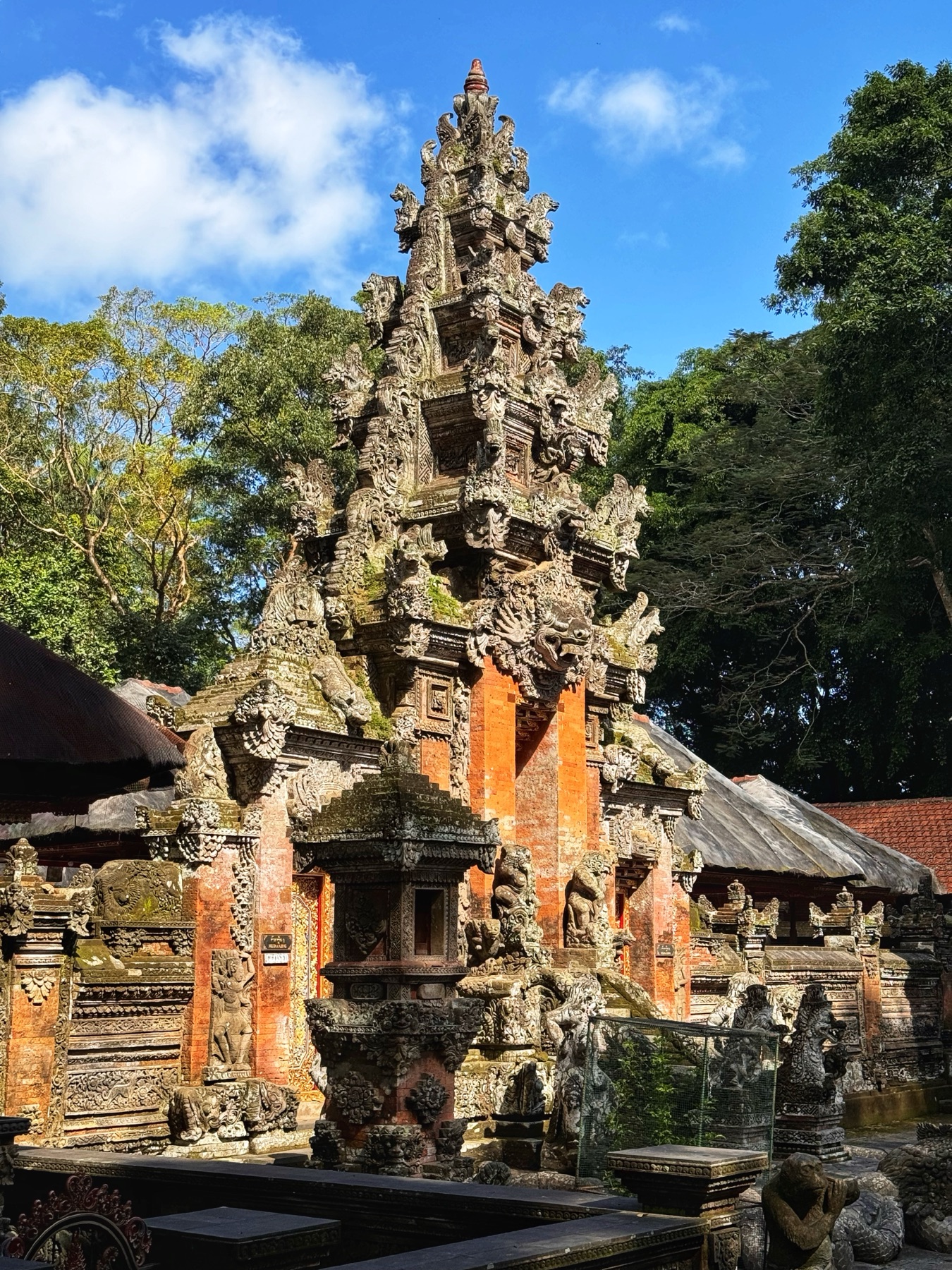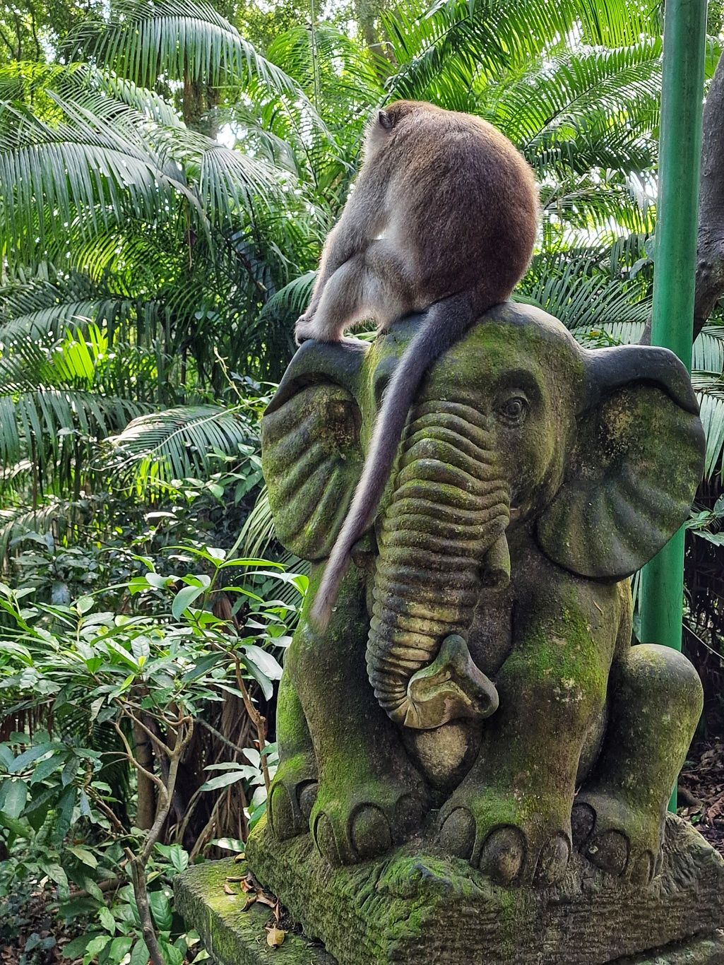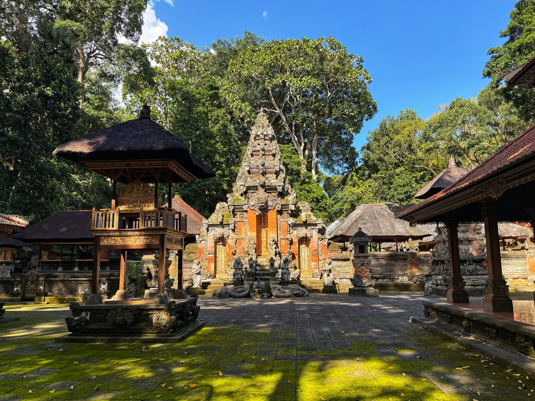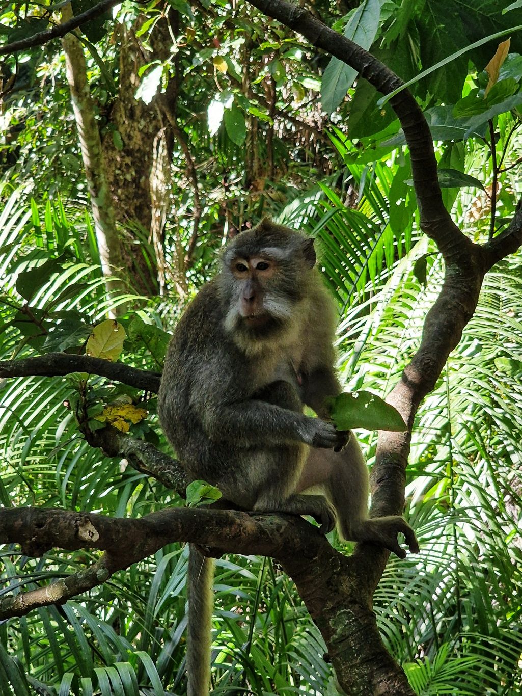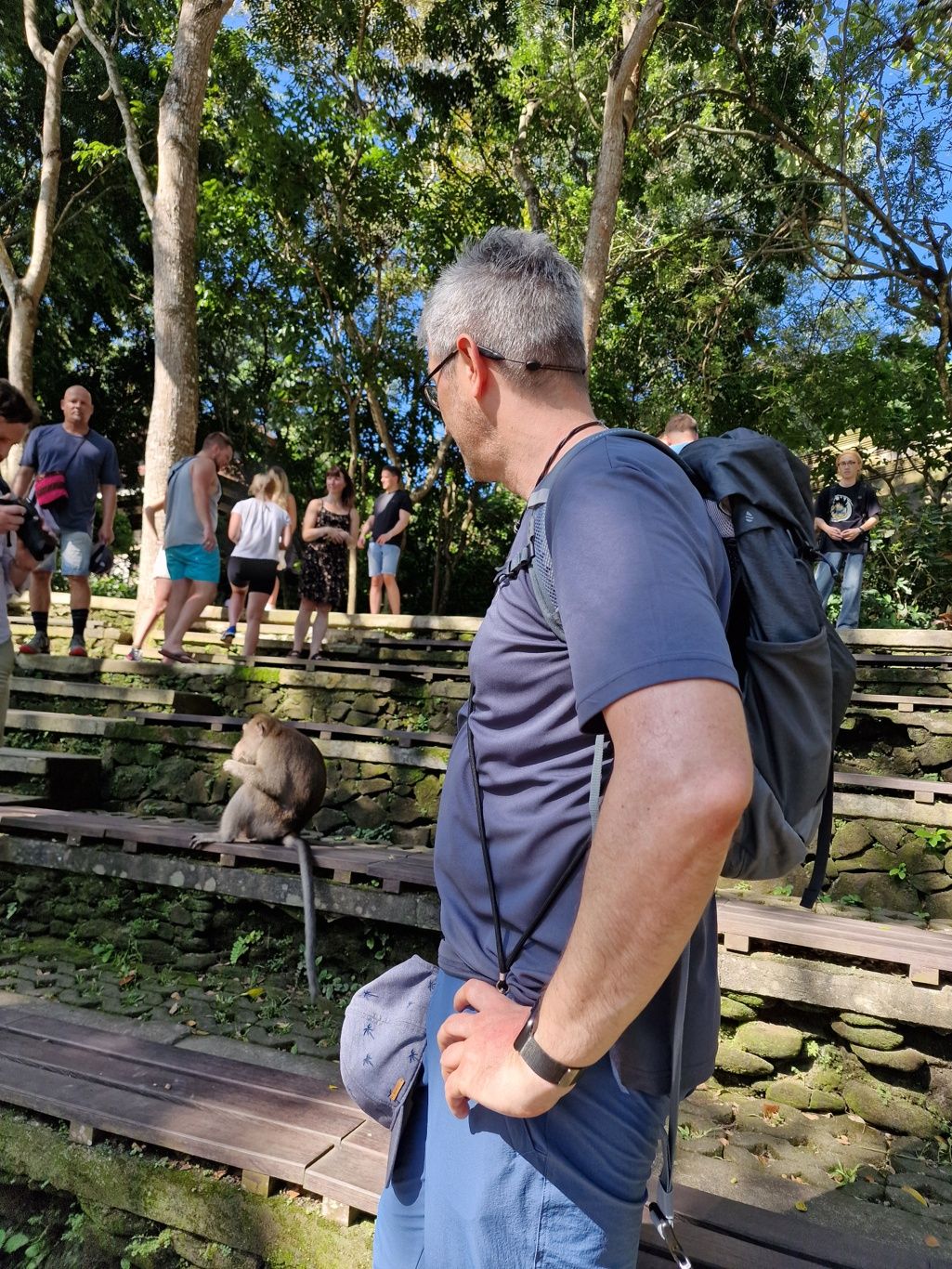 Zurück zum Hotel blieb noch genug Zeit für eine weitere Entdeckung. Zu einem Besuch in Ubud gehört auf jeden Fall auch ein Abstecher in den Affenwald. Praktischerweise ist der Eintritt nur 5 Minuten zu Fuß von unserer Unterkunft entfernt. Es handelt sich hierbei um einen kleinen Naturpark mit mehreren hinduistischen Tempeln eingebettet im Urwald. Und überall laufen kleine und große Makaken-Affen rum. Sehr lustig ihnen beim Spielen zuzusehen.