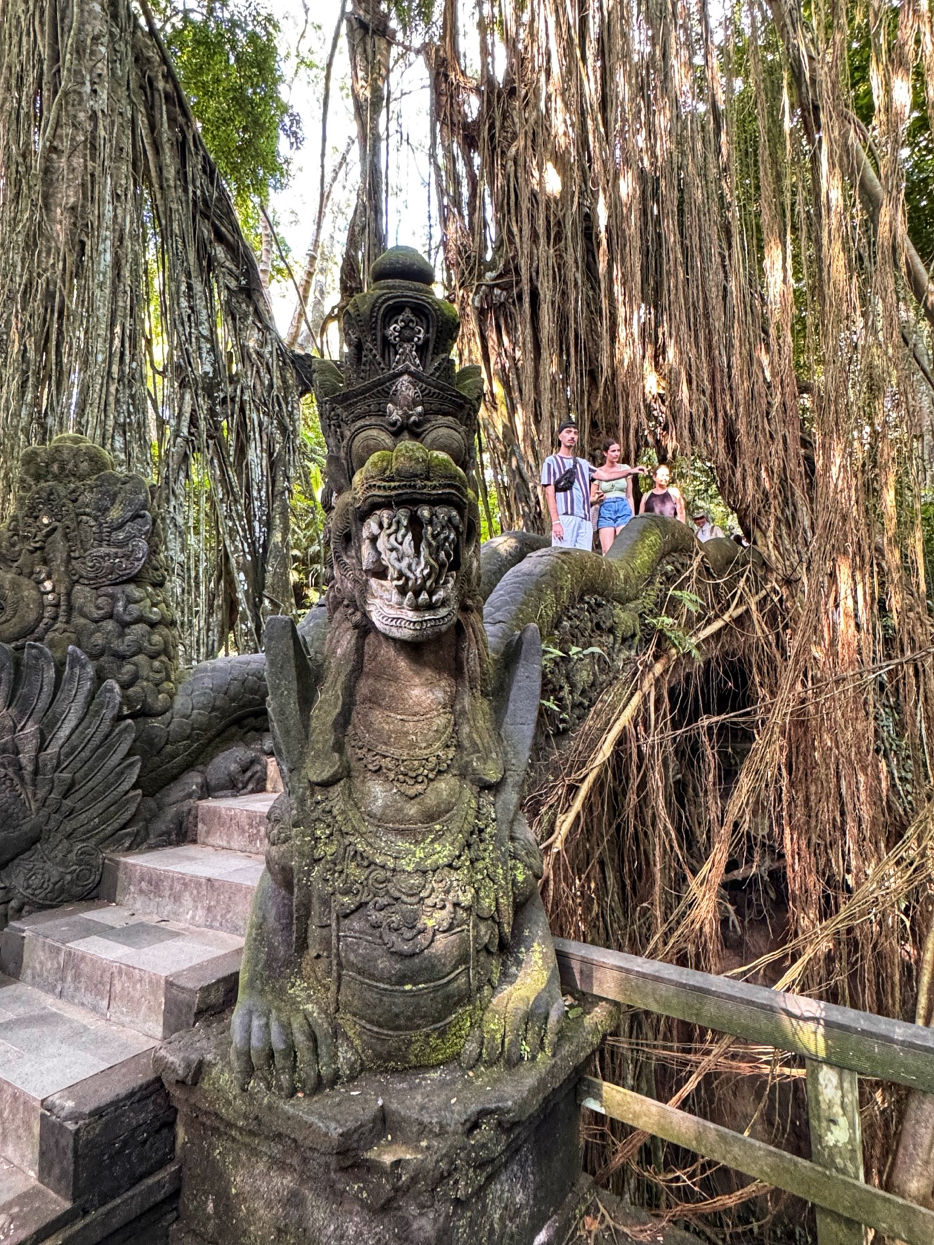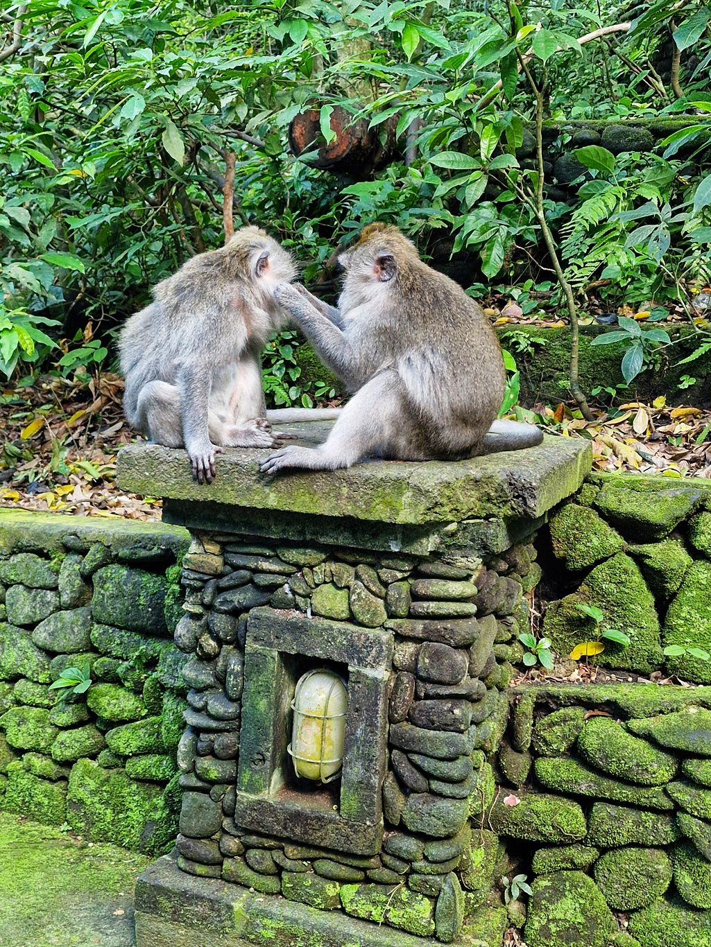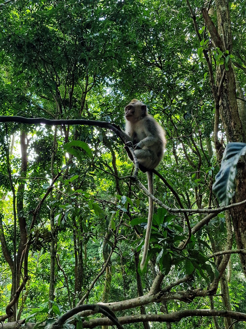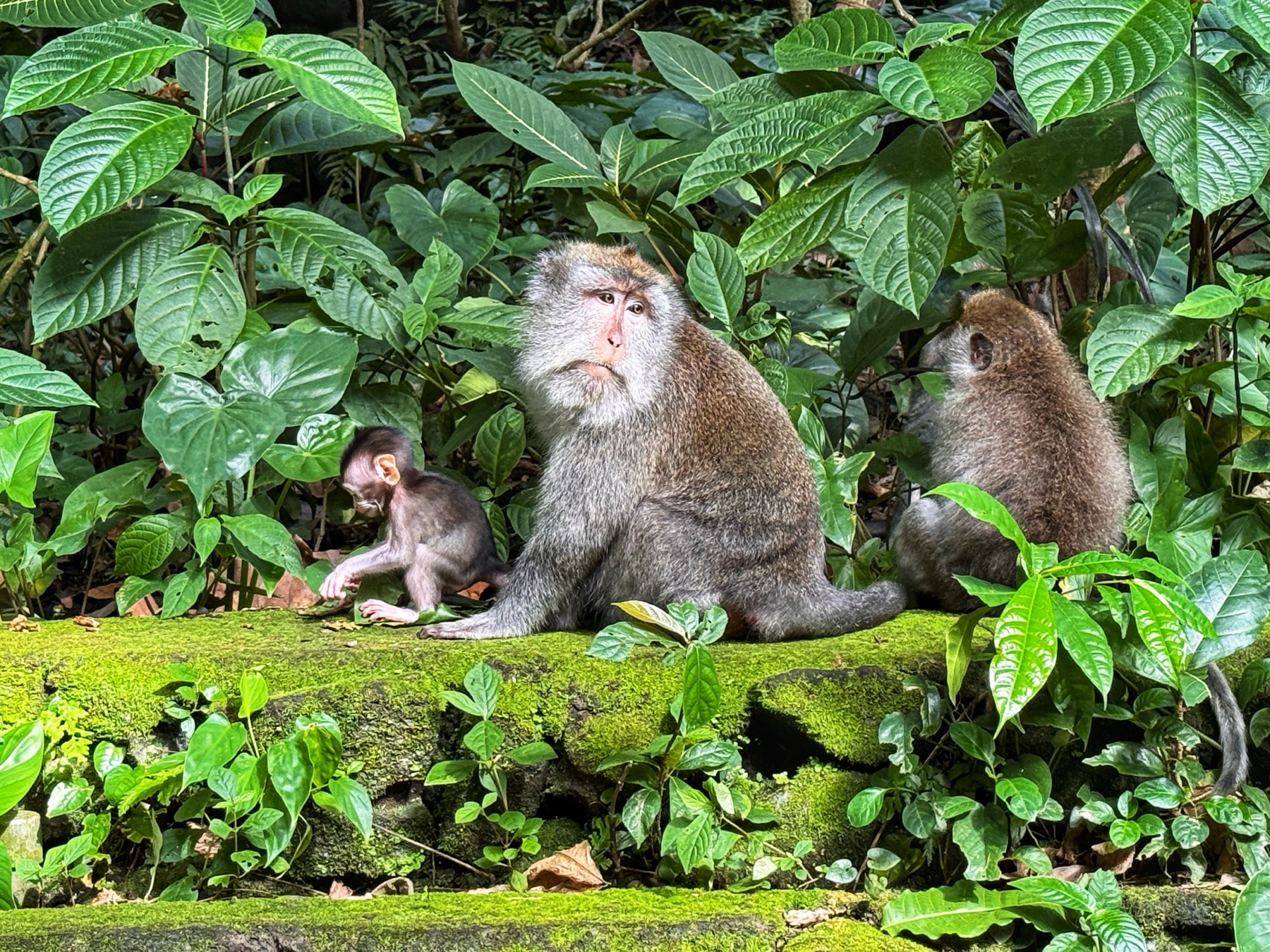 Zurück zum Hotel blieb noch genug Zeit für eine weitere Entdeckung. Zu einem Besuch in Ubud gehört auf jeden Fall auch ein Abstecher in den Affenwald. Praktischerweise ist der Eintritt nur 5 Minuten zu Fuß von unserer Unterkunft entfernt. Es handelt sich hierbei um einen kleinen Naturpark mit mehreren hinduistischen Tempeln eingebettet im Urwald. Und überall laufen kleine und große Makaken-Affen rum. Sehr lustig ihnen beim Spielen zuzusehen.