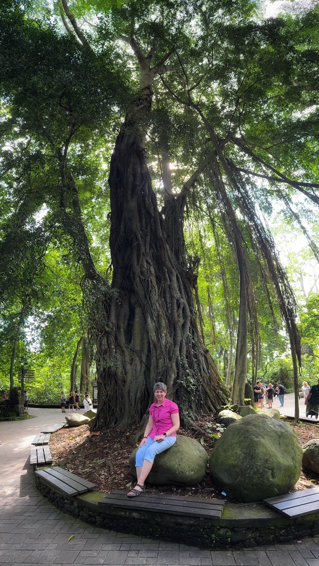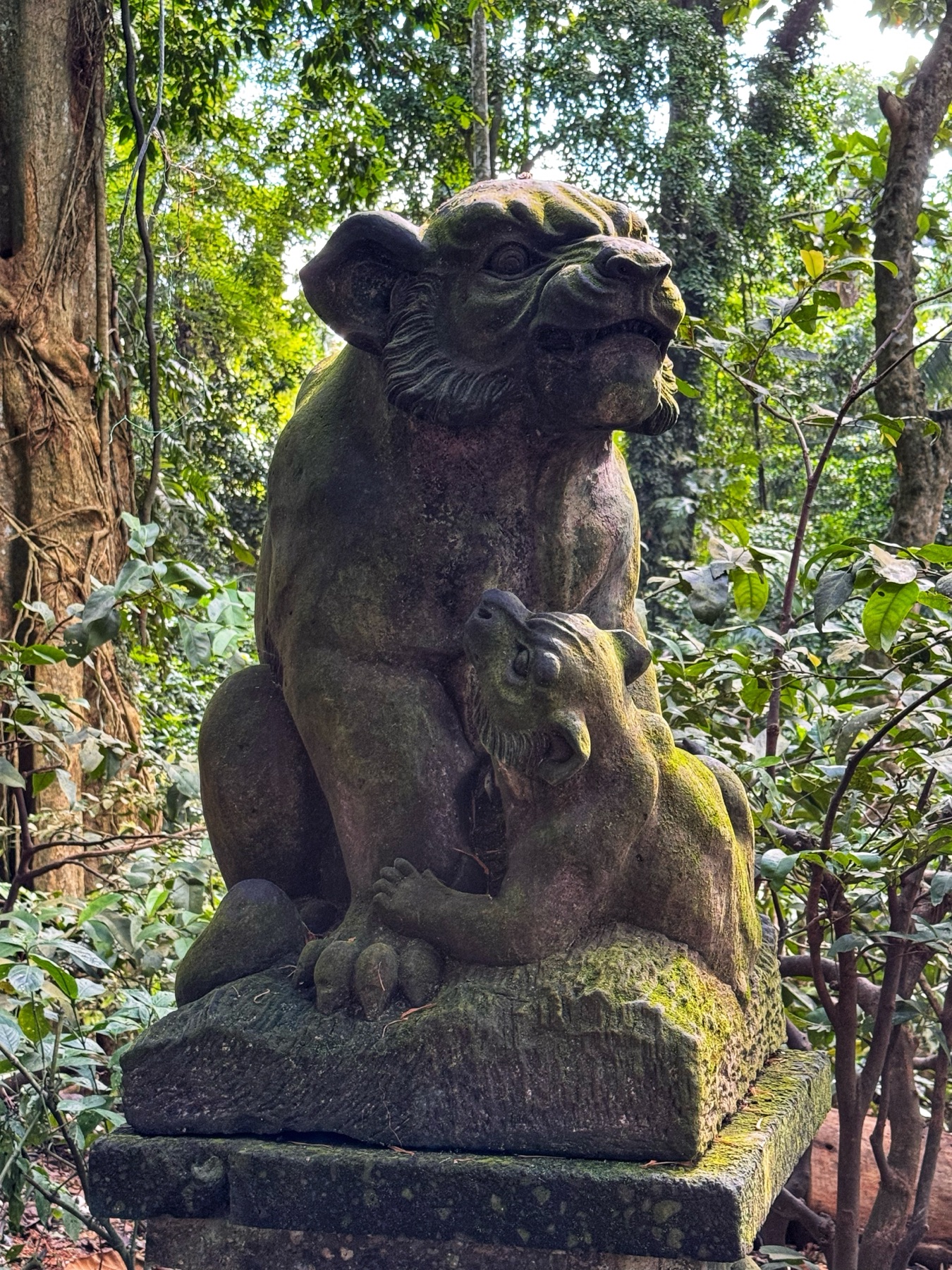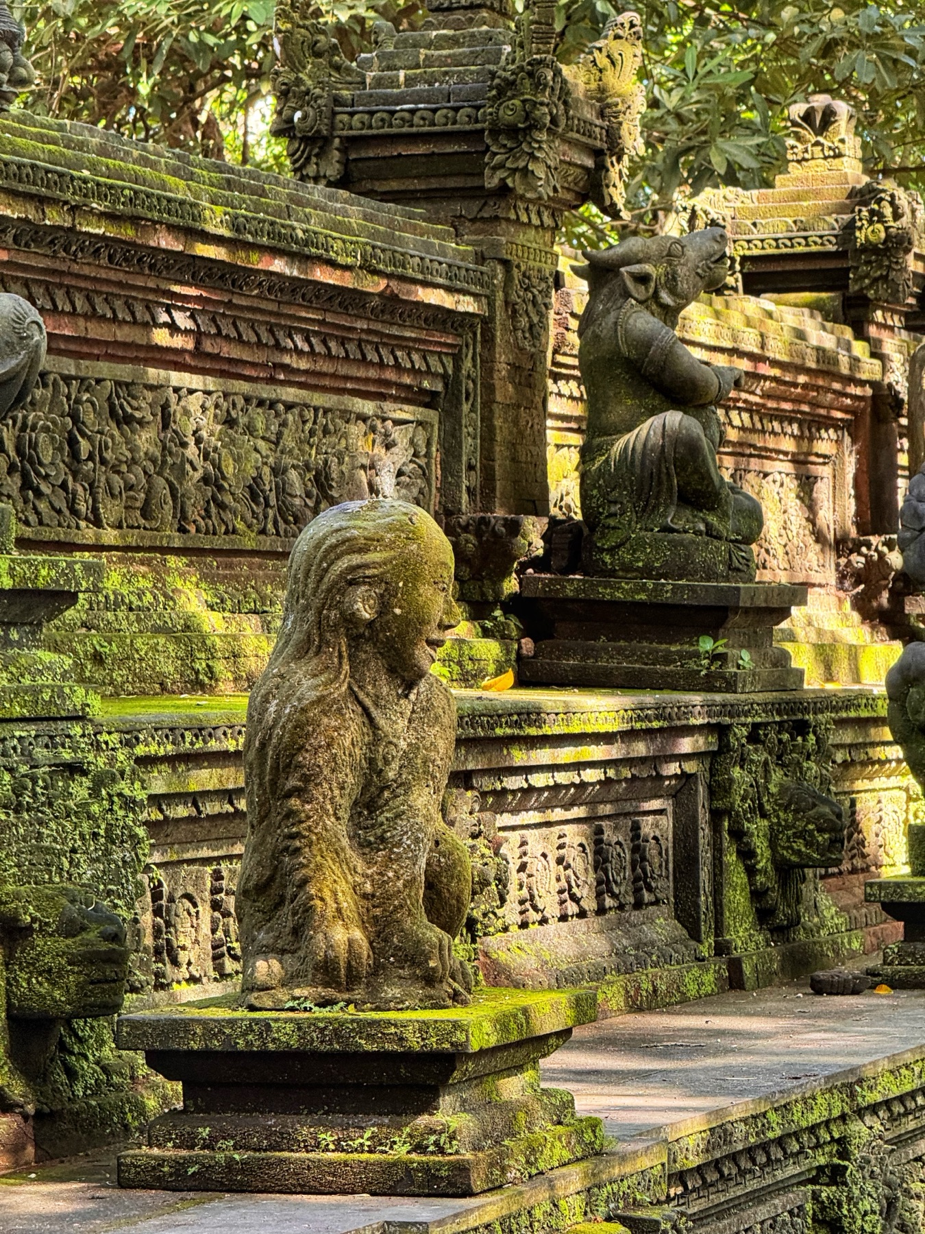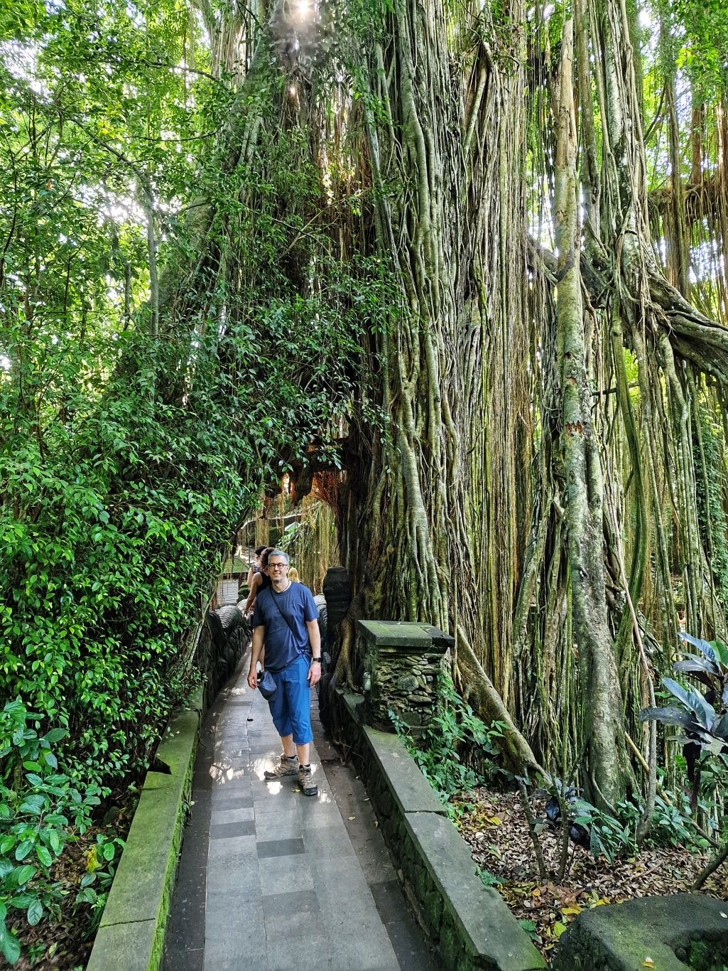Zurück zum Hotel blieb noch genug Zeit für eine weitere Entdeckung. Zu einem Besuch in Ubud gehört auf jeden Fall auch ein Abstecher in den Affenwald. Praktischerweise ist der Eintritt nur 5 Minuten zu Fuß von unserer Unterkunft entfernt. Es handelt sich hierbei um einen kleinen Naturpark mit mehreren hinduistischen Tempeln eingebettet im Urwald. Und überall laufen kleine und große Makaken-Affen rum. Sehr lustig ihnen beim Spielen zuzusehen.