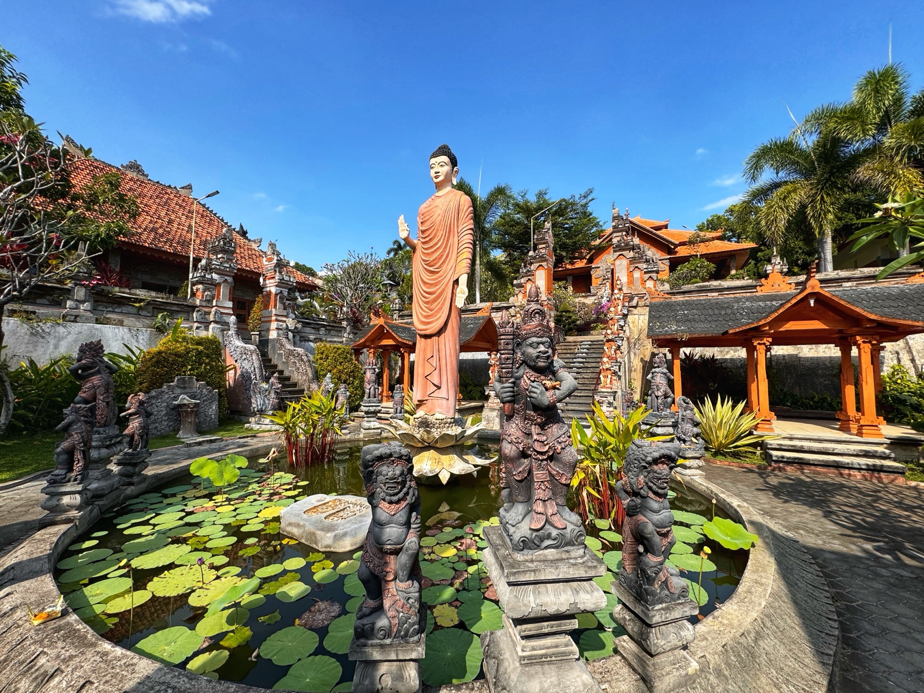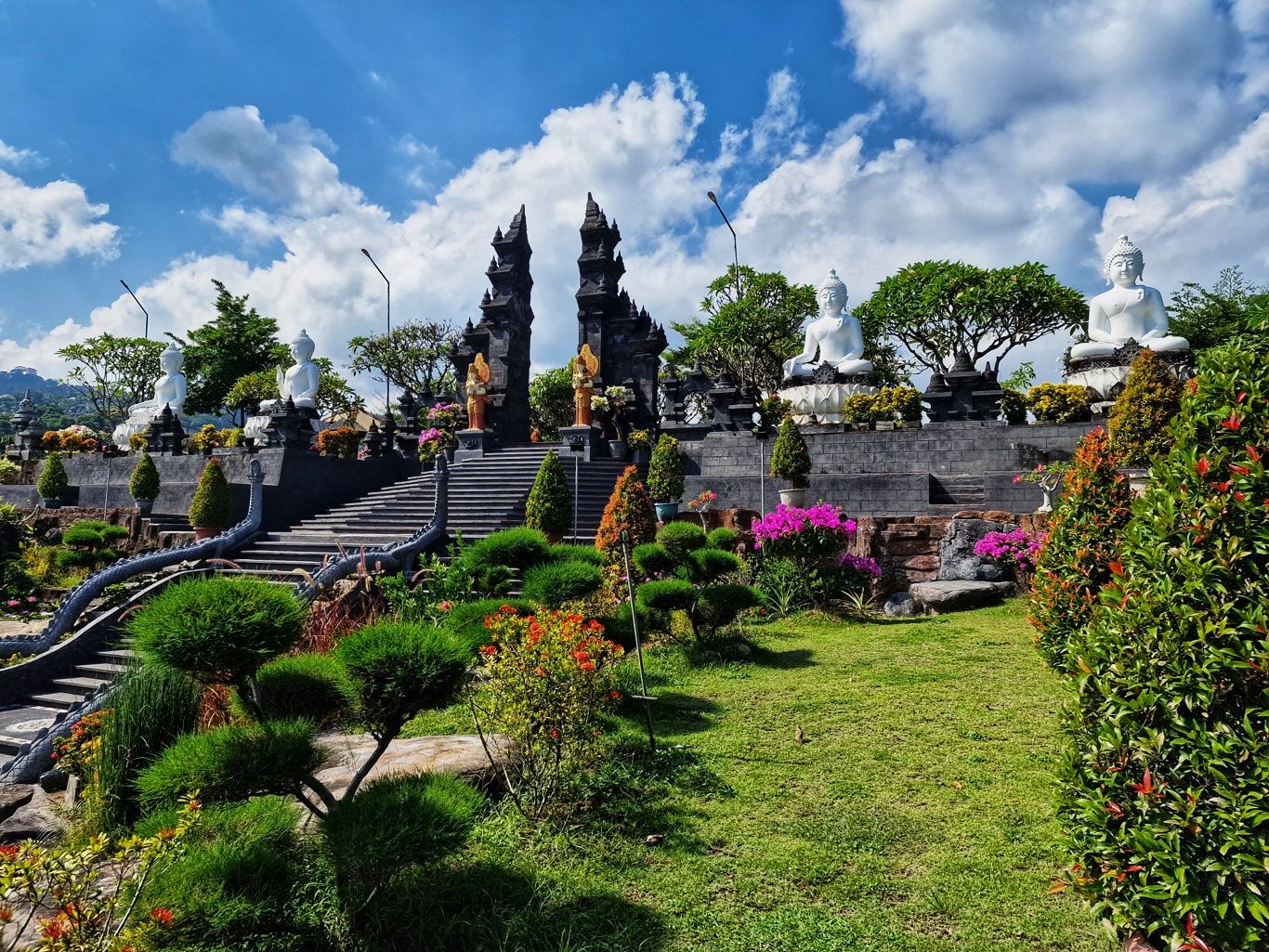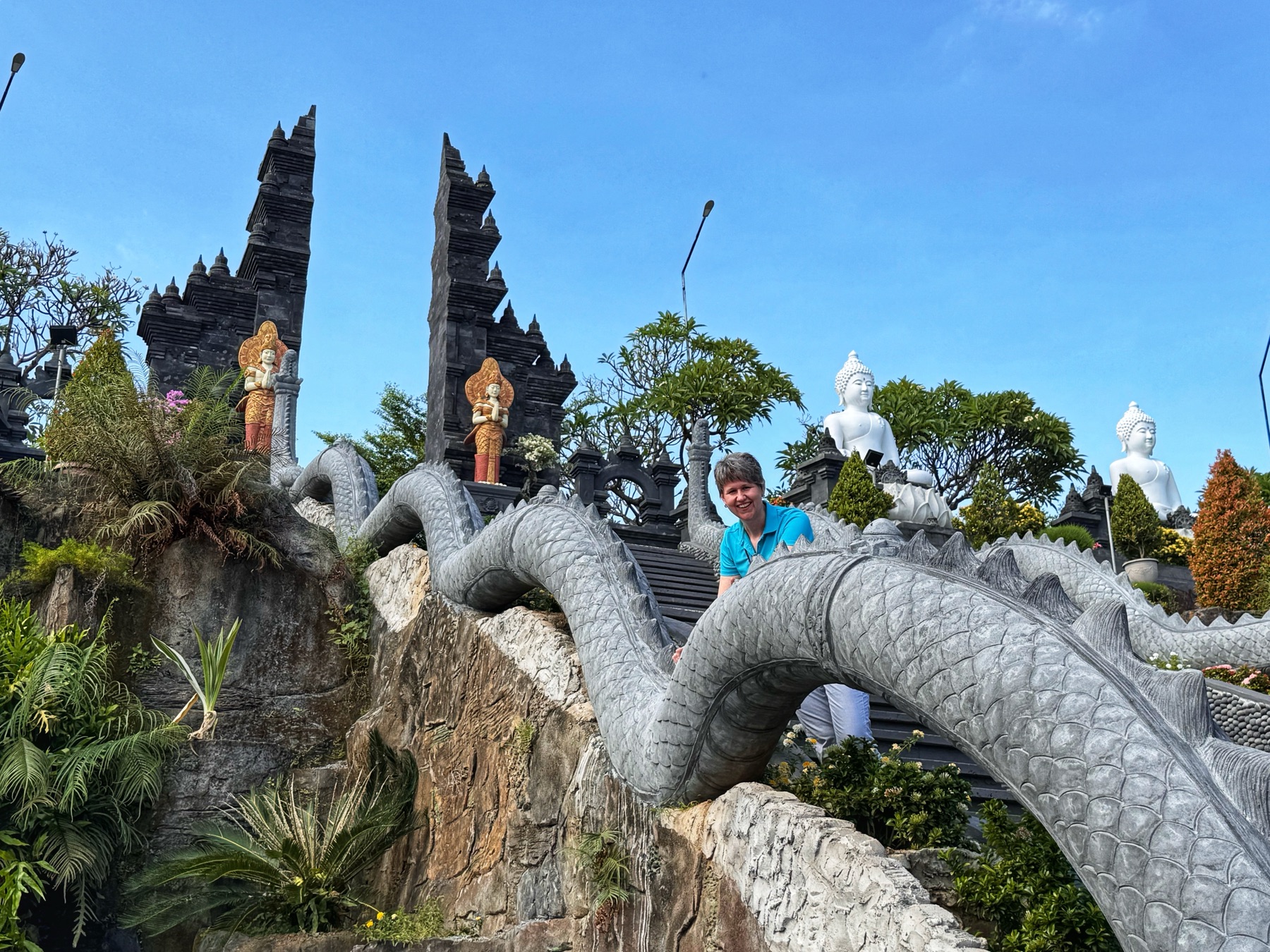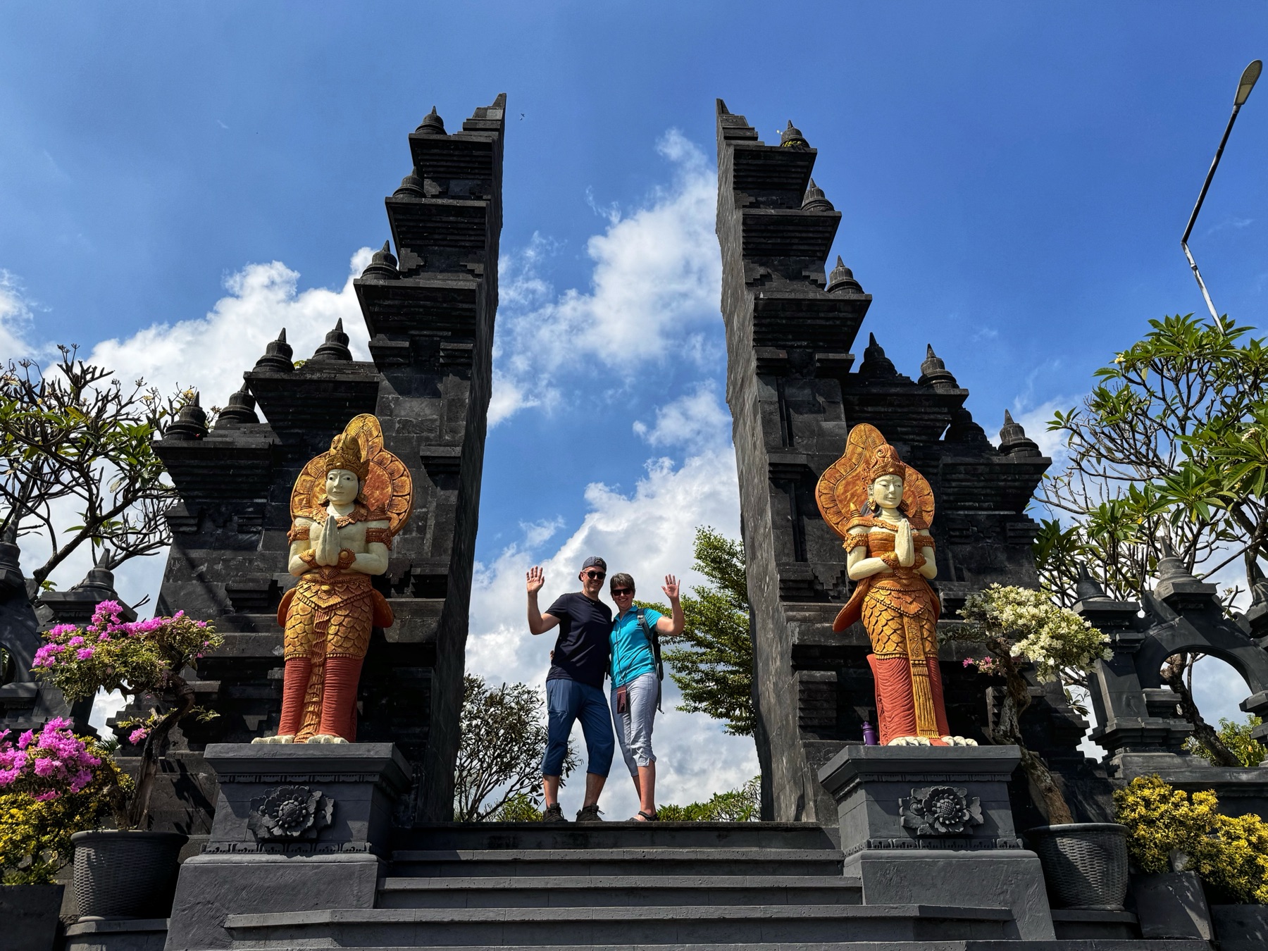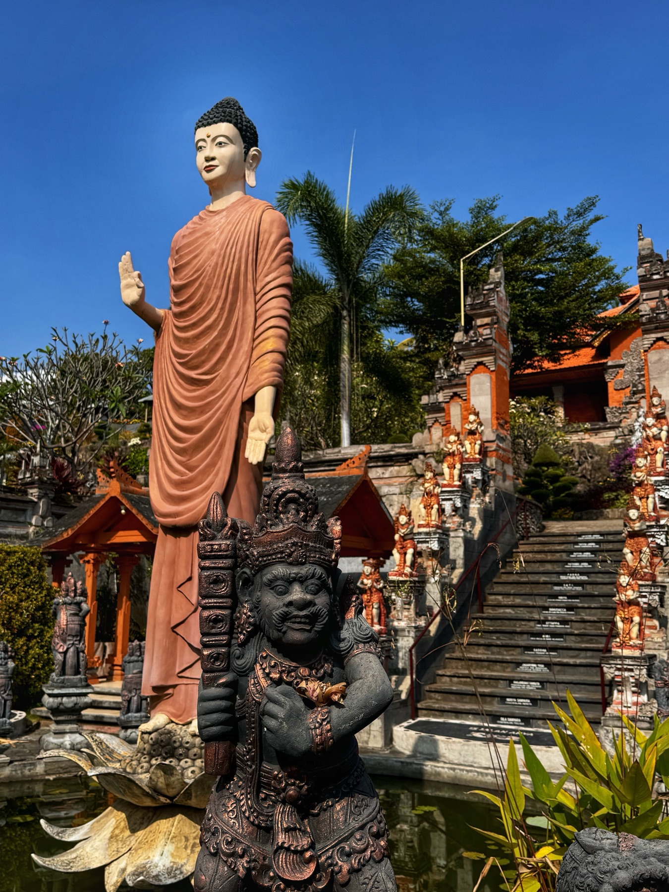 So hatte Ivan wieder eine fantastische Lösung. Er fuhr uns zu einem wunderschönen, buddhistischen Tempel, wo wir fast ganz alleine waren. Ein traumhaftes Fleckchen Erde mit tollen buddhistischen Statuen kombiniert mit hinduistischen Elementen, eingebettet in einen wunderschönen Blumengarten. Wir waren absolut begeistert und zum Schluss bekamen wir auch noch unser Foto am Himmelstor, denn die Tempel in Bali haben in der Regel alle ein solches Tor. Wenn wir es euch nicht verraten hätten, wäre es niemandem aufgefallen, oder?😂