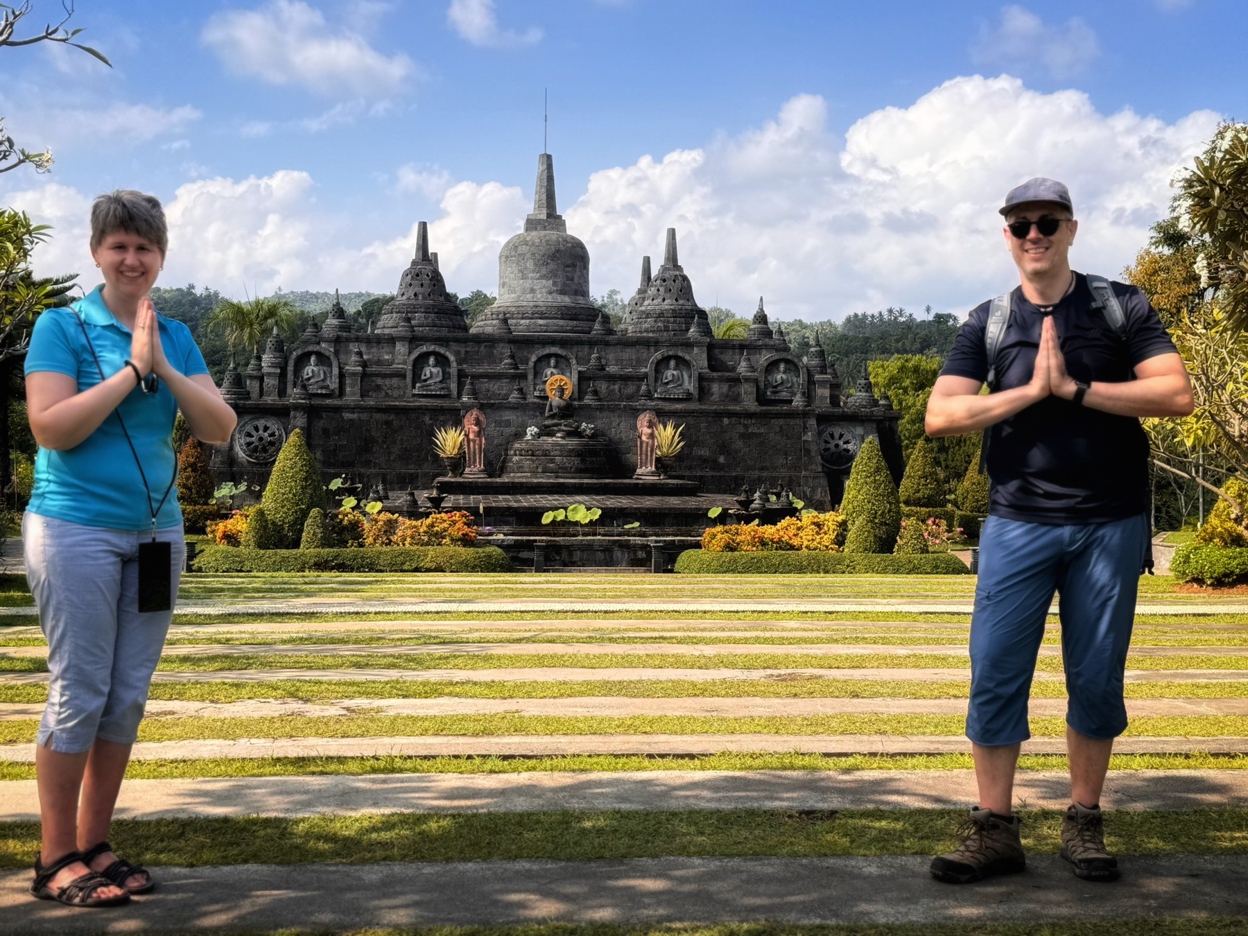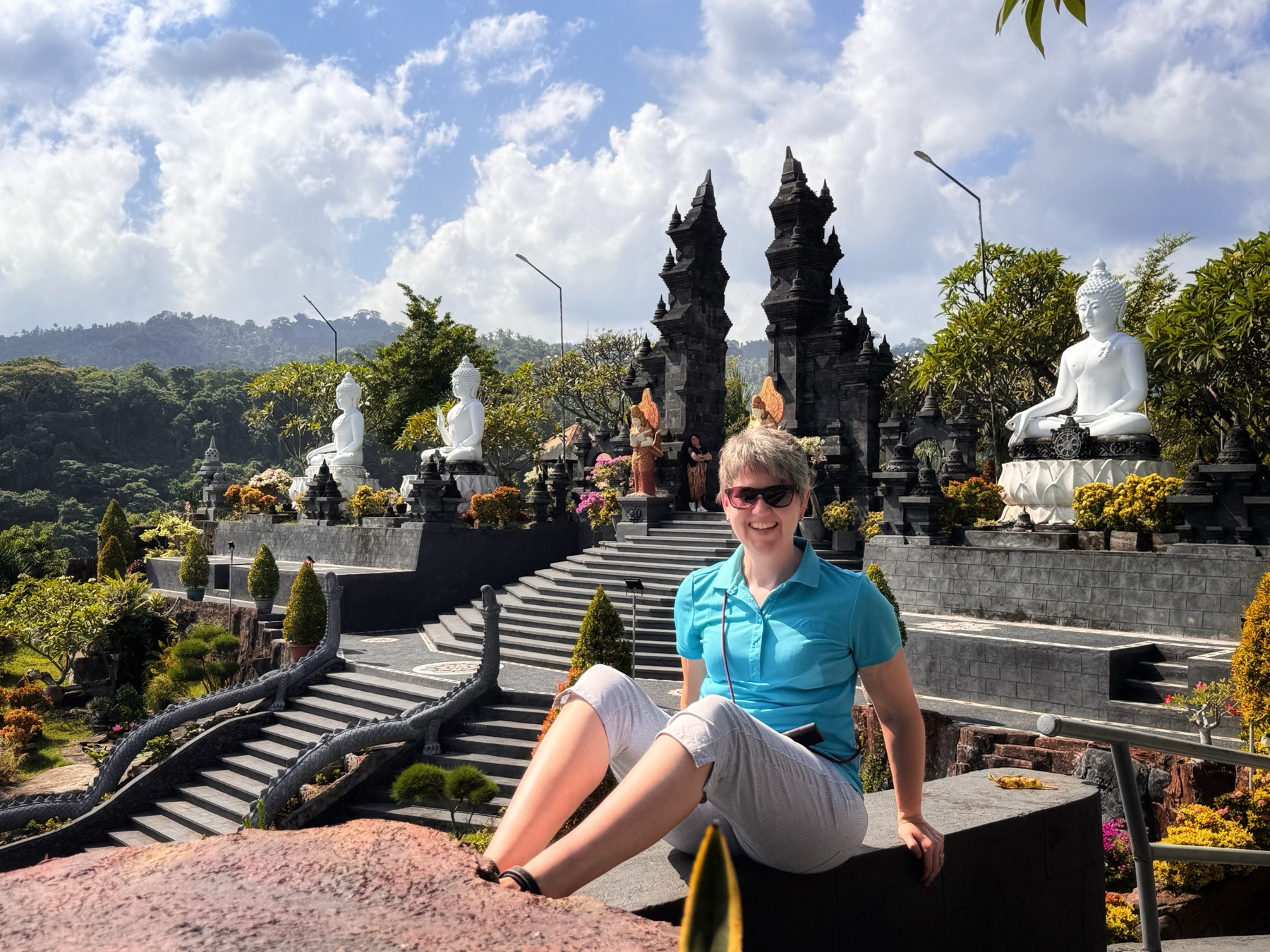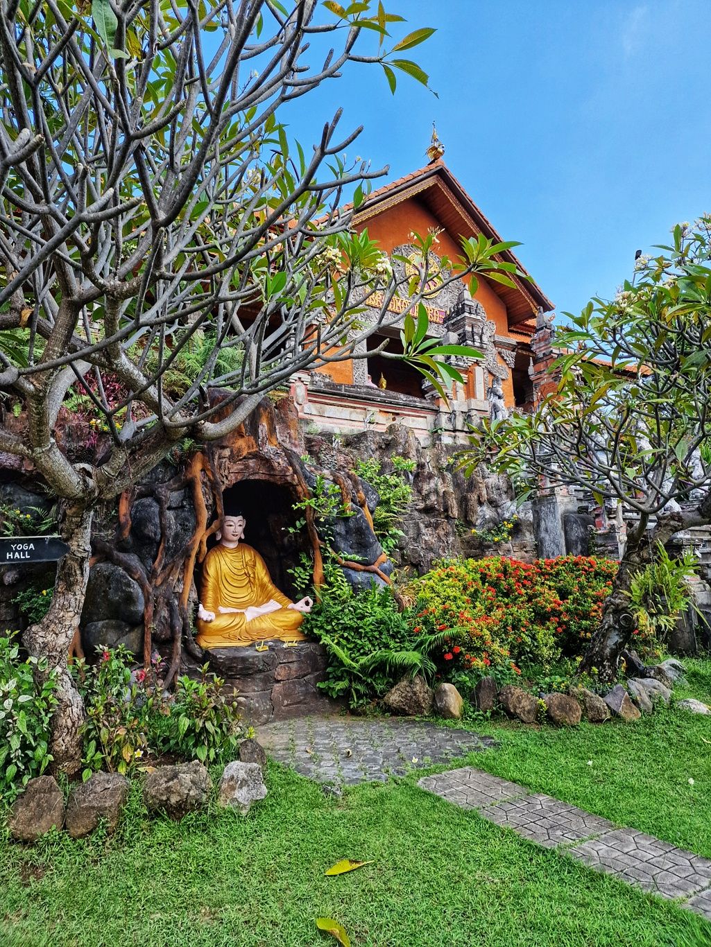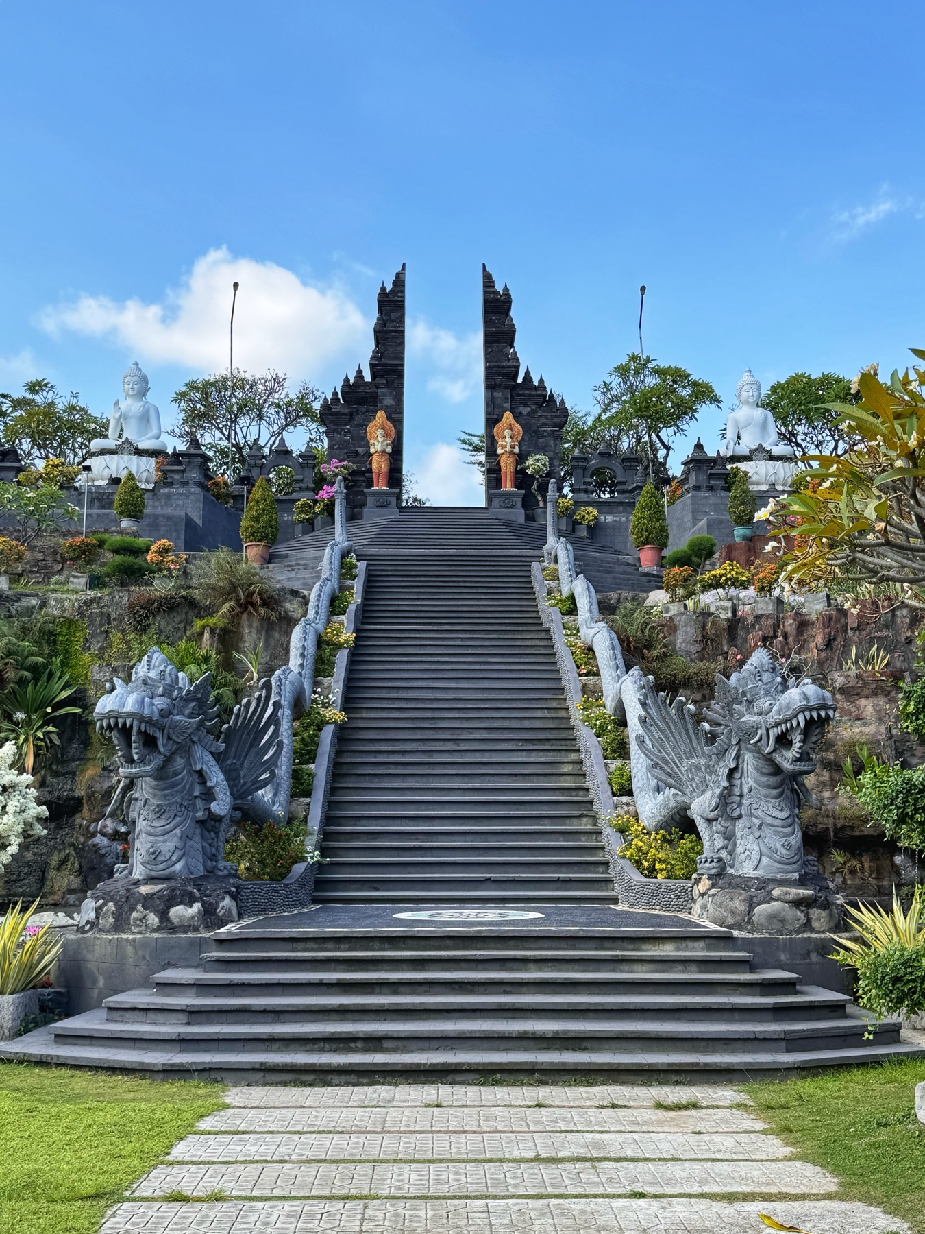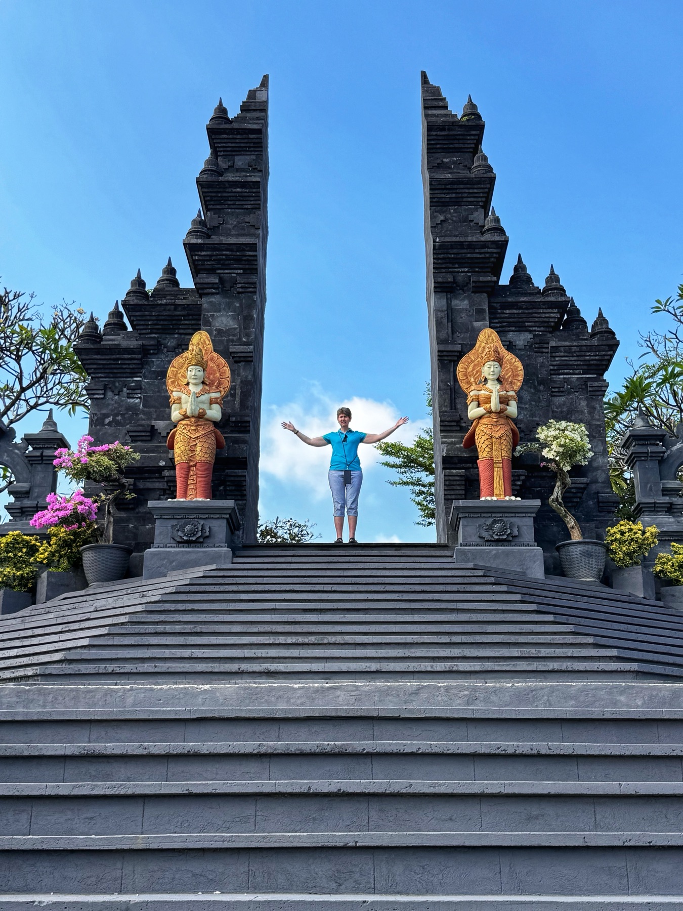 So hatte Ivan wieder eine fantastische Lösung. Er fuhr uns zu einem wunderschönen, buddhistischen Tempel, wo wir fast ganz alleine waren. Ein traumhaftes Fleckchen Erde mit tollen buddhistischen Statuen kombiniert mit hinduistischen Elementen, eingebettet in einen wunderschönen Blumengarten. Wir waren absolut begeistert und zum Schluss bekamen wir auch noch unser Foto am Himmelstor, denn die Tempel in Bali haben in der Regel alle ein solches Tor. Wenn wir es euch nicht verraten hätten, wäre es niemandem aufgefallen, oder?😂