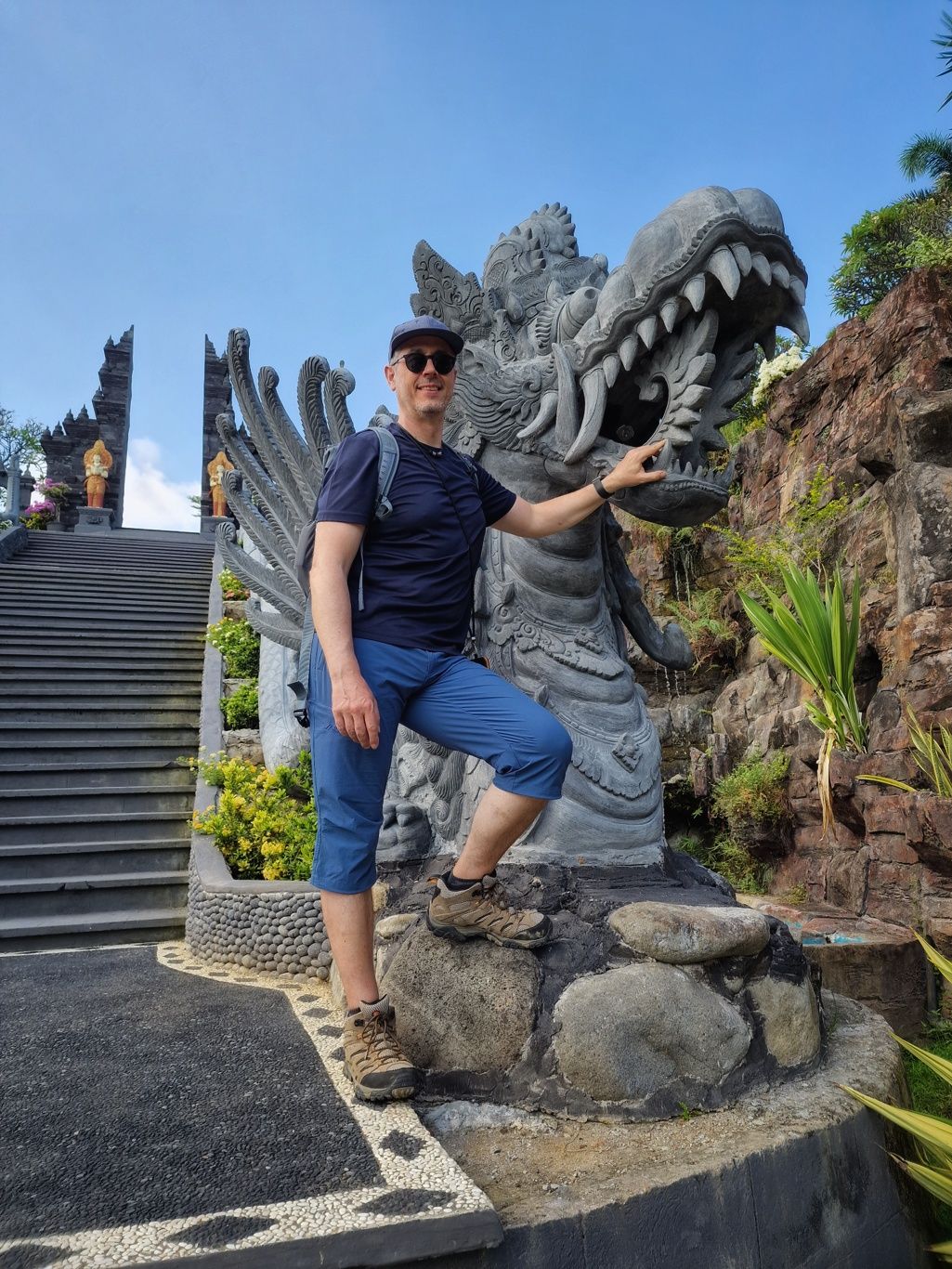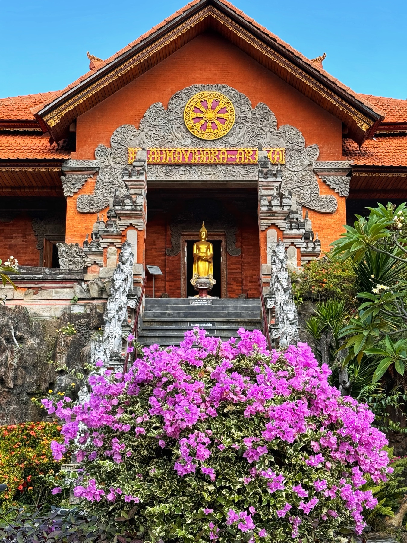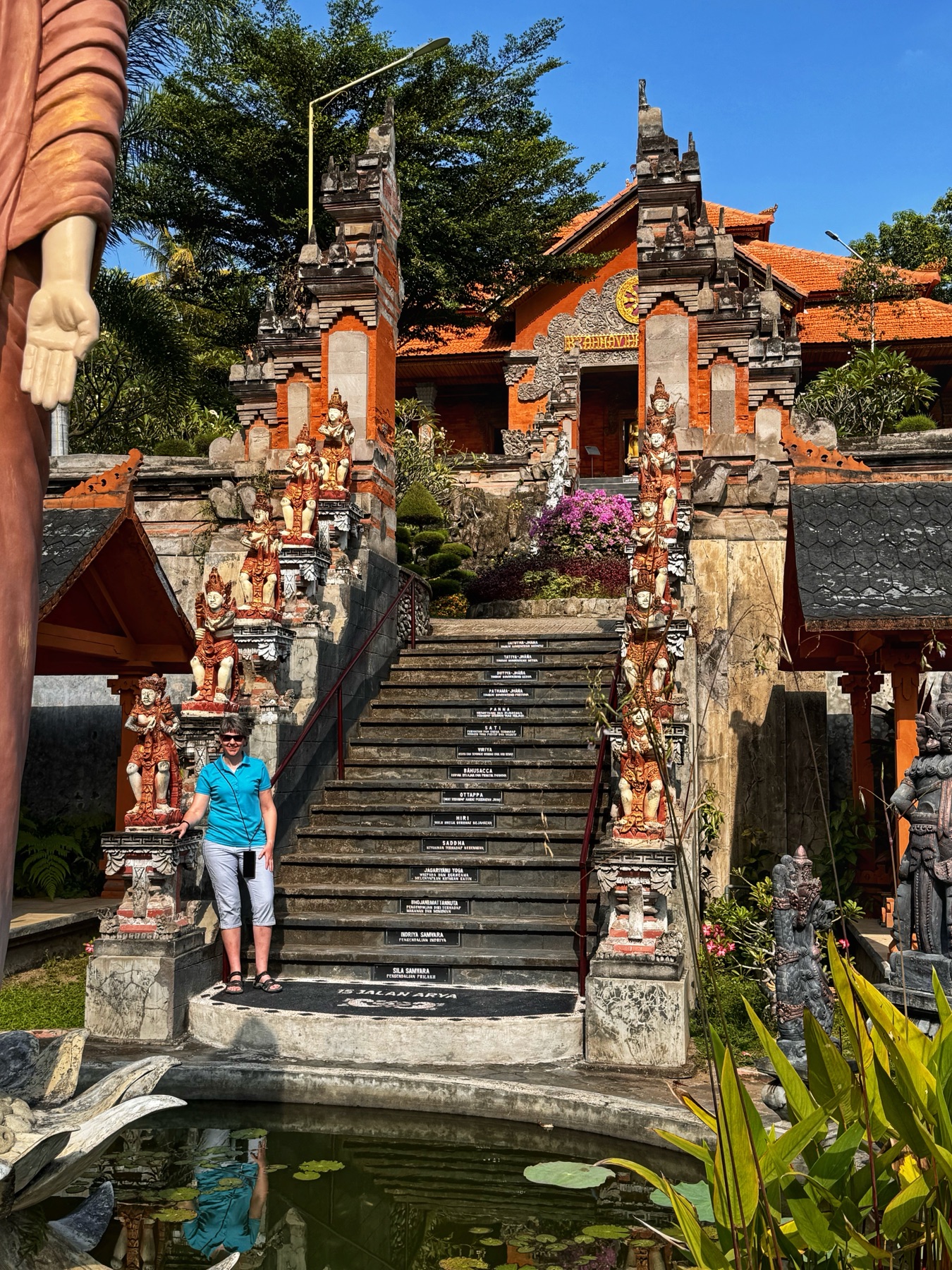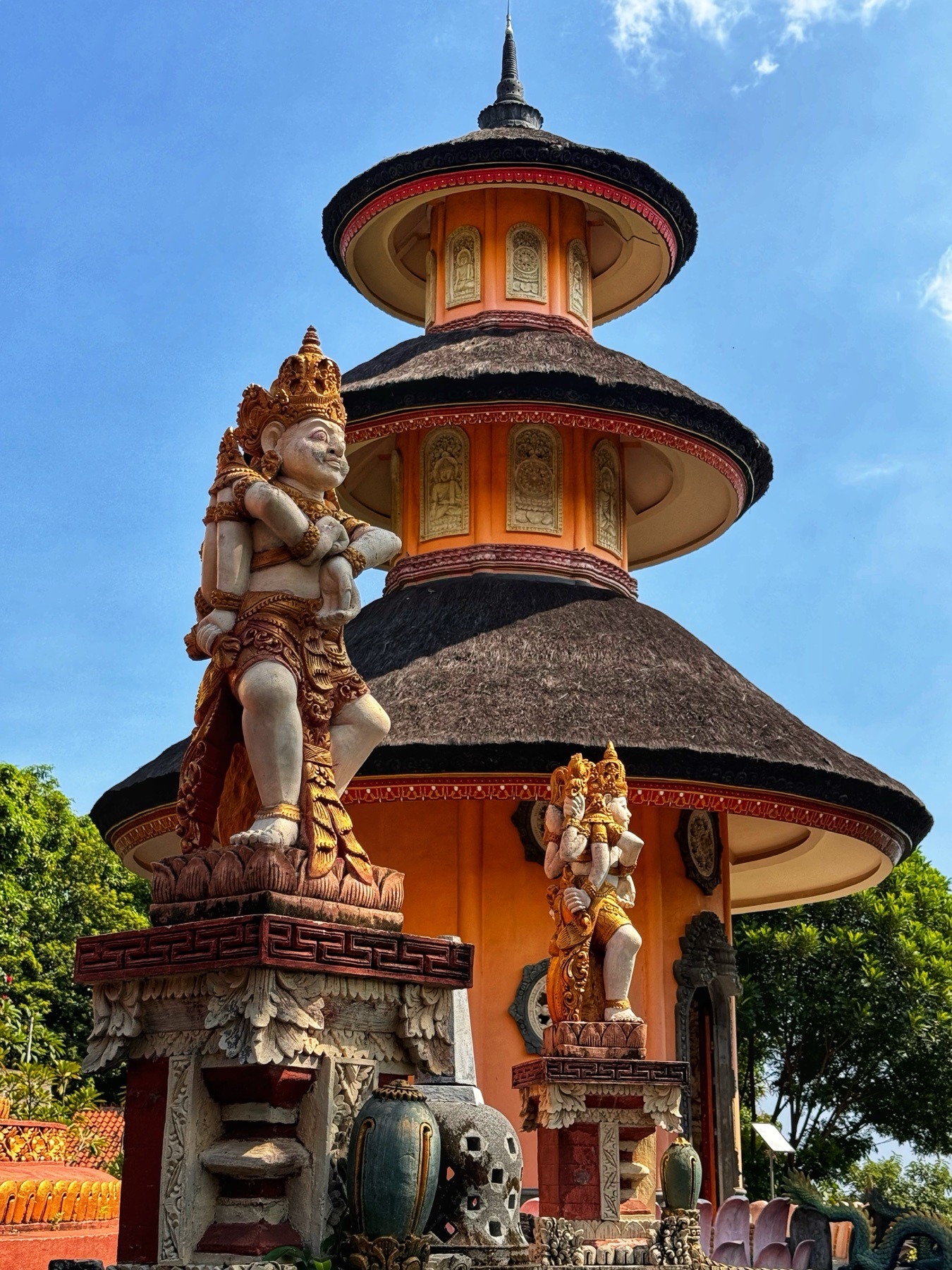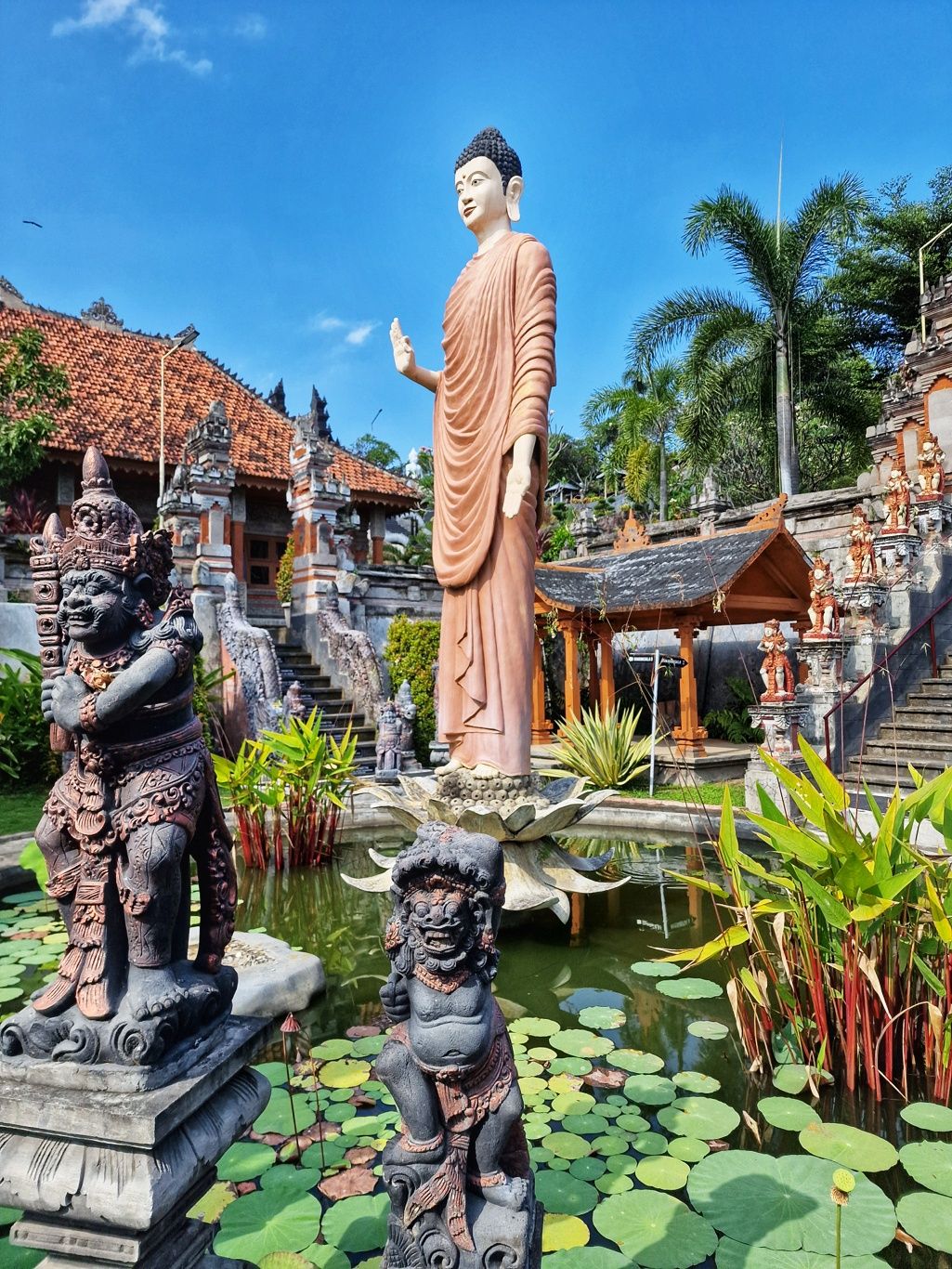 So hatte Ivan wieder eine fantastische Lösung. Er fuhr uns zu einem wunderschönen, buddhistischen Tempel, wo wir fast ganz alleine waren. Ein traumhaftes Fleckchen Erde mit tollen buddhistischen Statuen kombiniert mit hinduistischen Elementen, eingebettet in einen wunderschönen Blumengarten. Wir waren absolut begeistert und zum Schluss bekamen wir auch noch unser Foto am Himmelstor, denn die Tempel in Bali haben in der Regel alle ein solches Tor. Wenn wir es euch nicht verraten hätten, wäre es niemandem aufgefallen, oder?😂