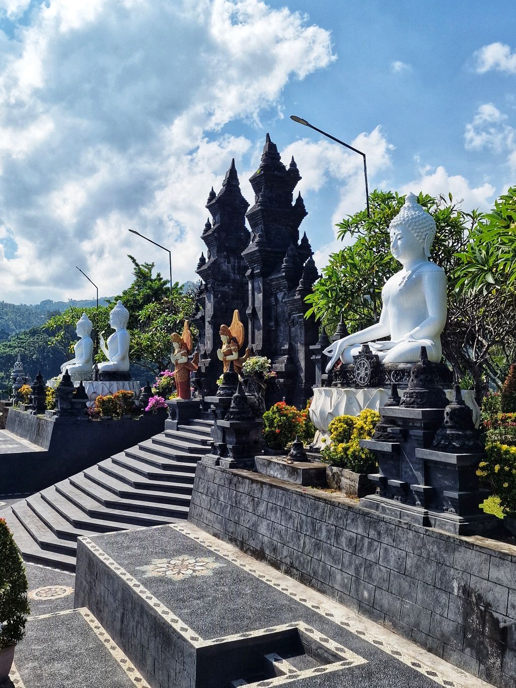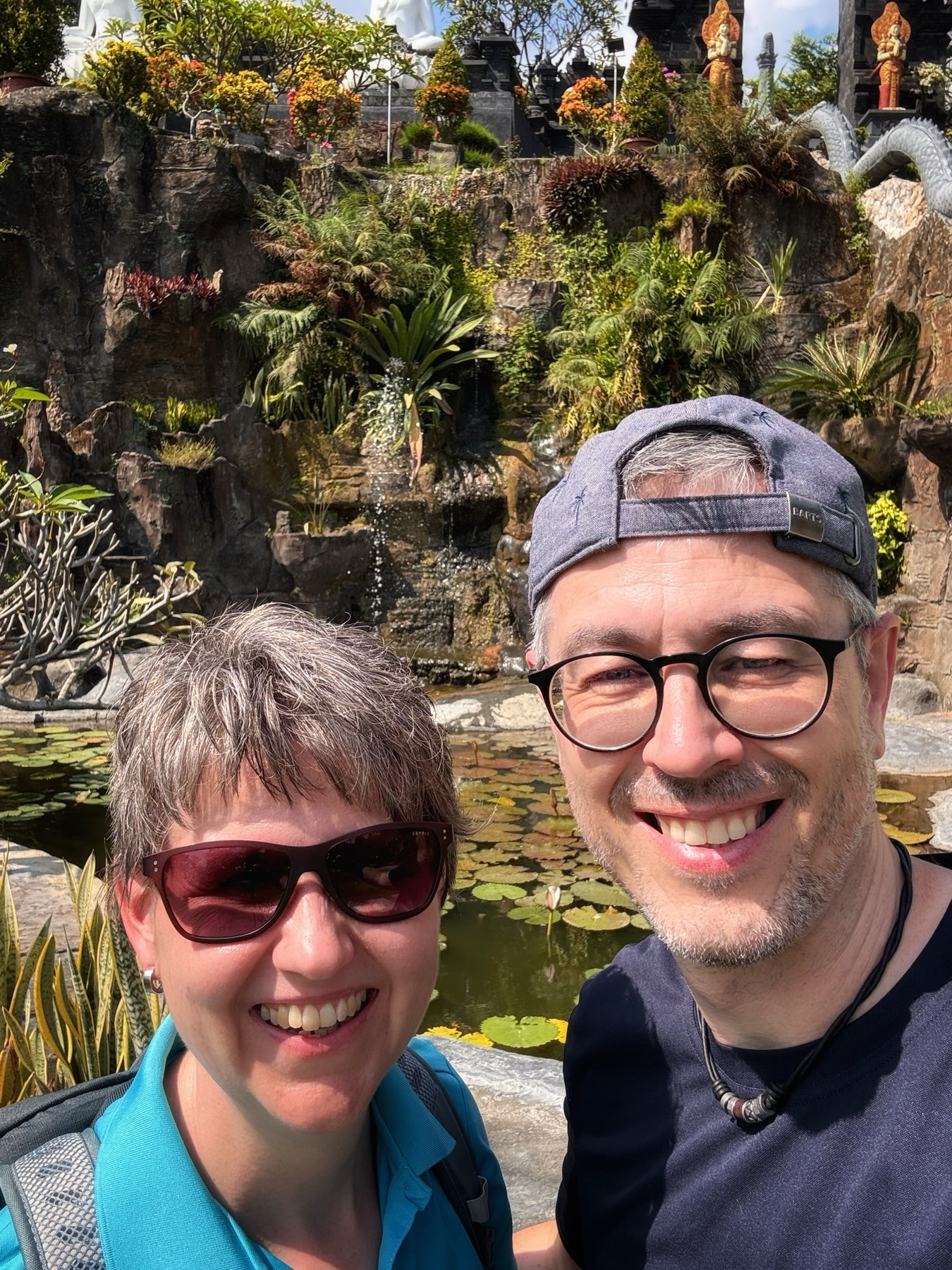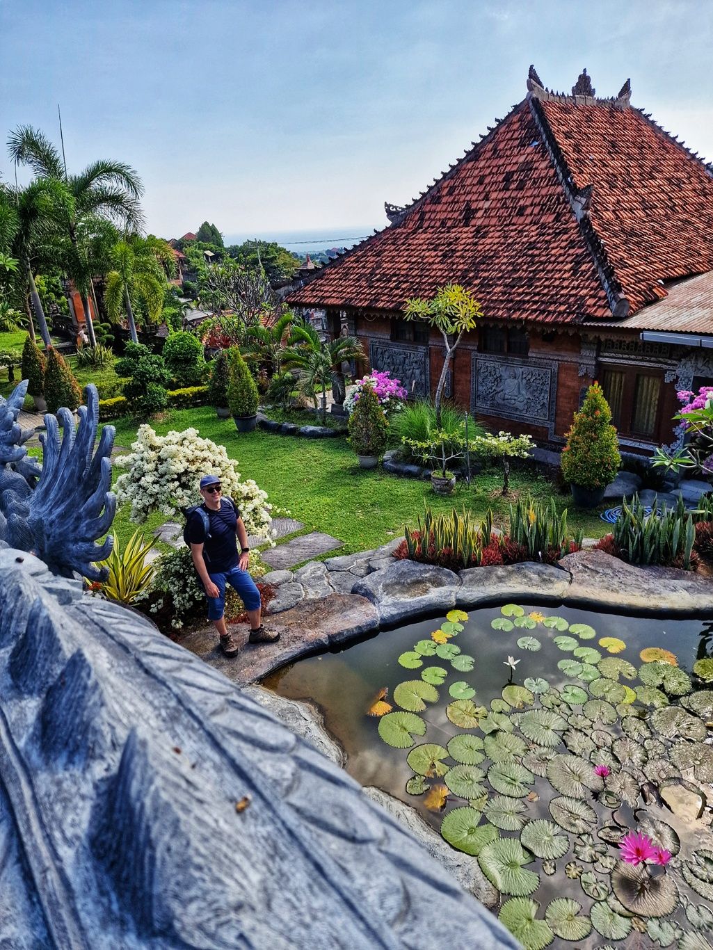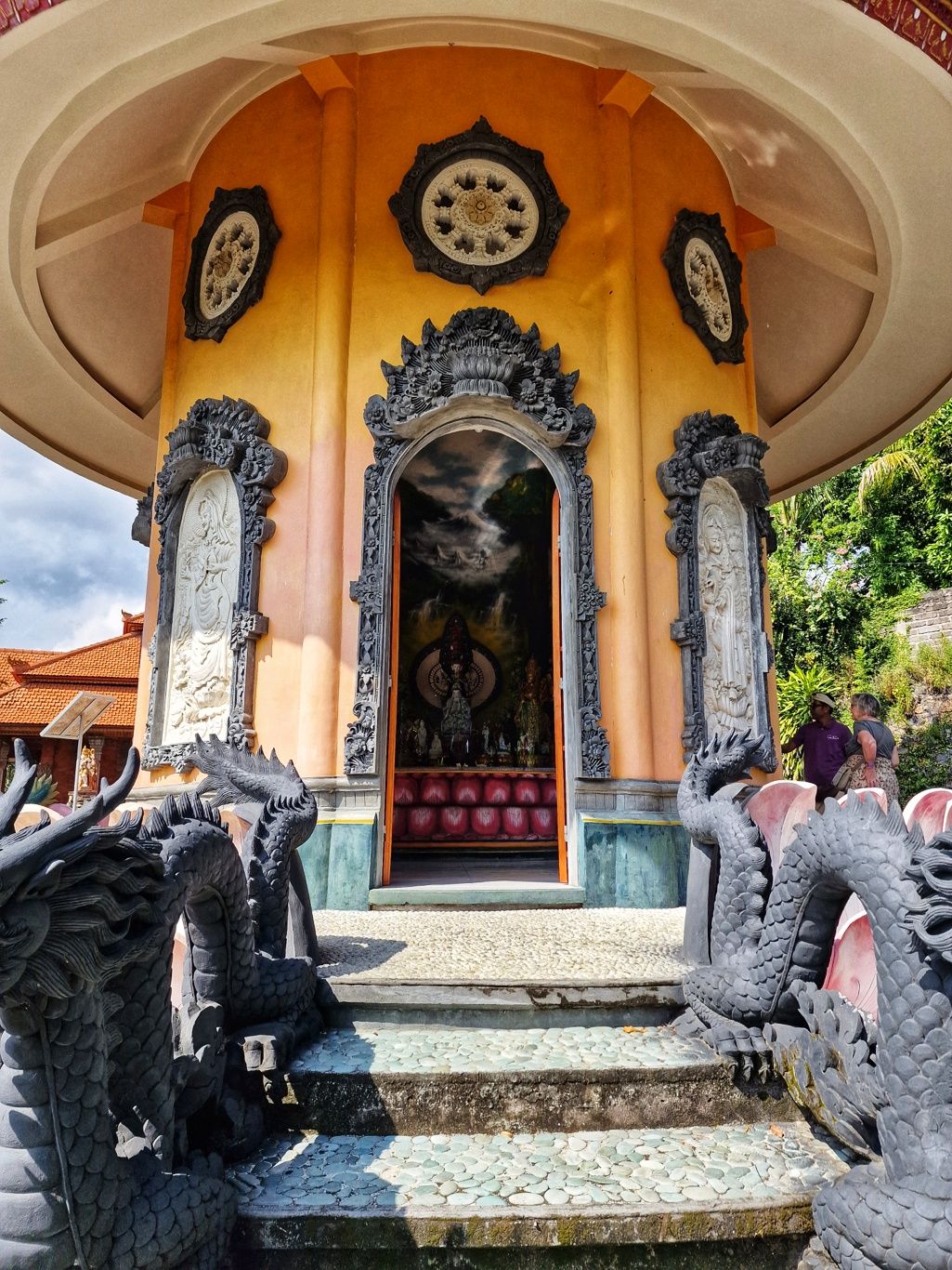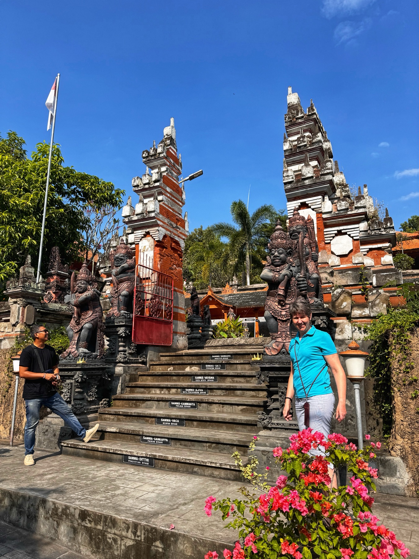 So hatte Ivan wieder eine fantastische Lösung. Er fuhr uns zu einem wunderschönen, buddhistischen Tempel, wo wir fast ganz alleine waren. Ein traumhaftes Fleckchen Erde mit tollen buddhistischen Statuen kombiniert mit hinduistischen Elementen, eingebettet in einen wunderschönen Blumengarten. Wir waren absolut begeistert und zum Schluss bekamen wir auch noch unser Foto am Himmelstor, denn die Tempel in Bali haben in der Regel alle ein solches Tor. Wenn wir es euch nicht verraten hätten, wäre es niemandem aufgefallen, oder?😂
