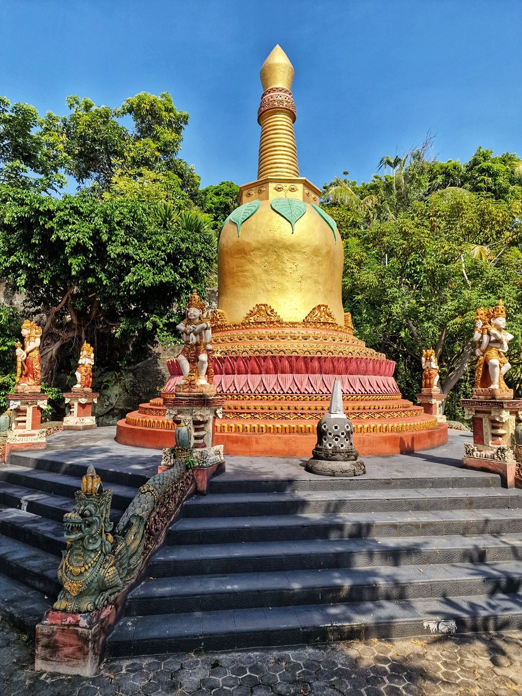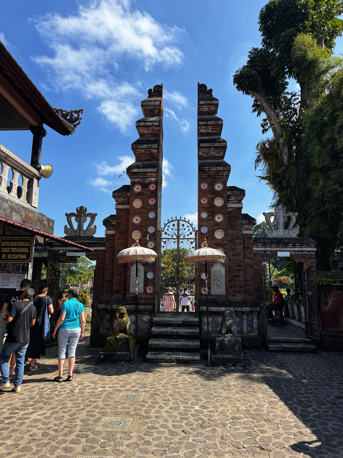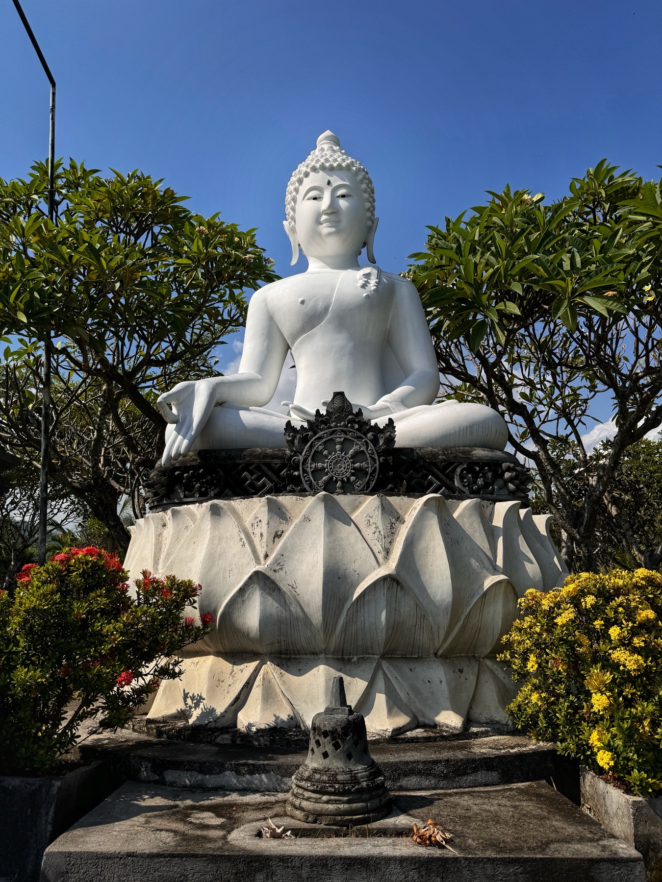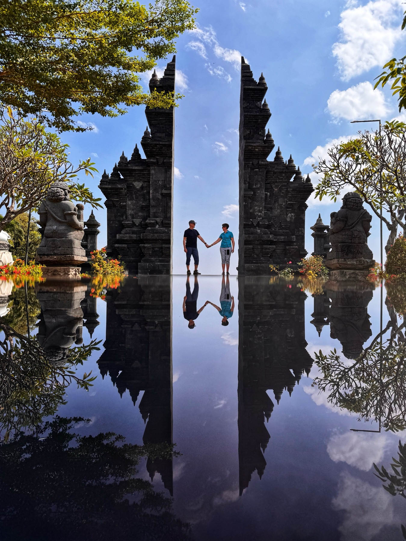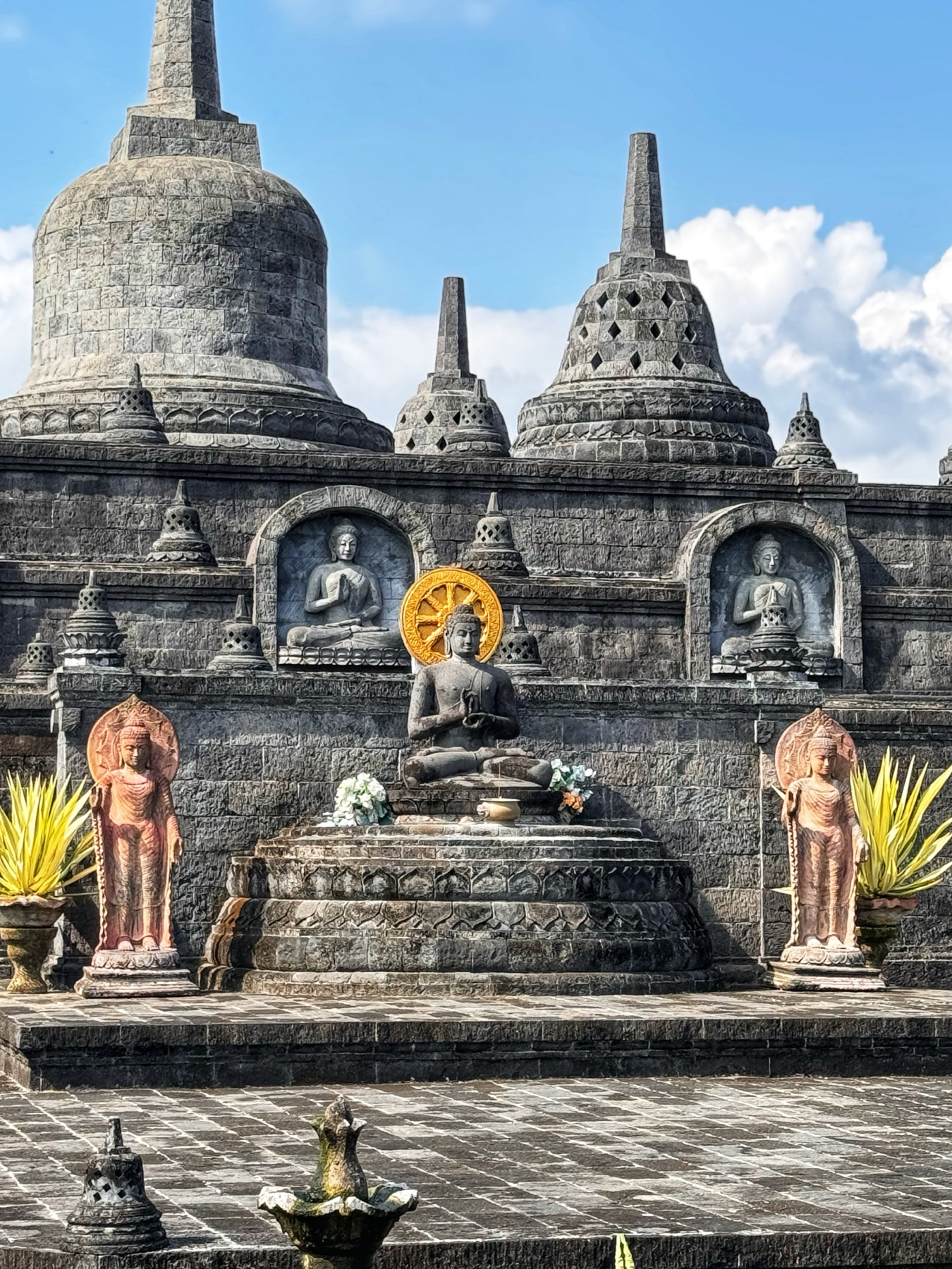 So hatte Ivan wieder eine fantastische Lösung. Er fuhr uns zu einem wunderschönen, buddhistischen Tempel, wo wir fast ganz alleine waren. Ein traumhaftes Fleckchen Erde mit tollen buddhistischen Statuen kombiniert mit hinduistischen Elementen, eingebettet in einen wunderschönen Blumengarten. Wir waren absolut begeistert und zum Schluss bekamen wir auch noch unser Foto am Himmelstor, denn die Tempel in Bali haben in der Regel alle ein solches Tor. Wenn wir es euch nicht verraten hätten, wäre es niemandem aufgefallen, oder?😂