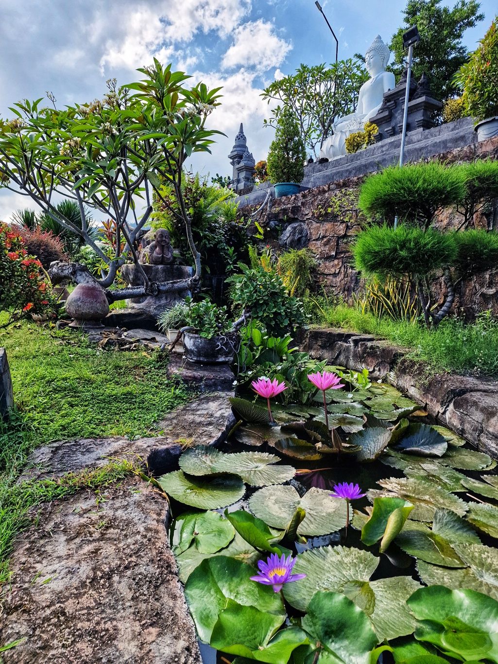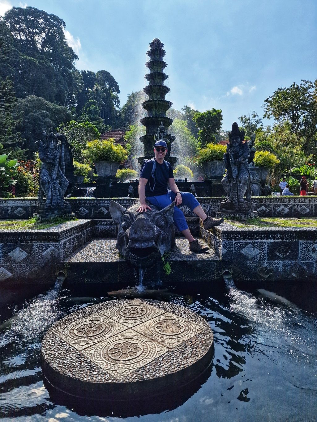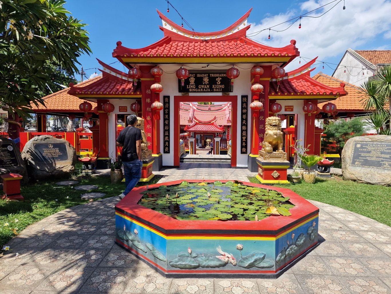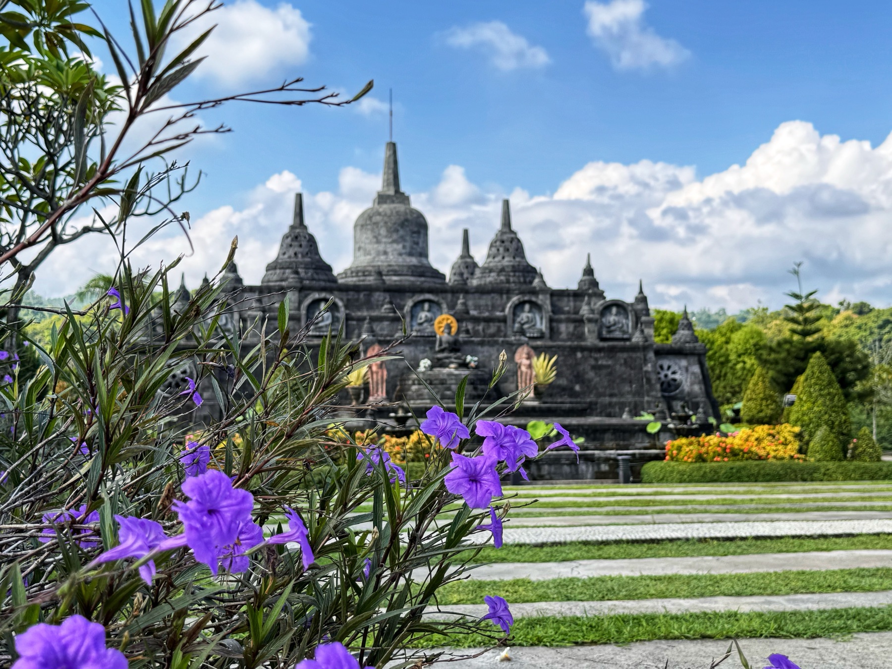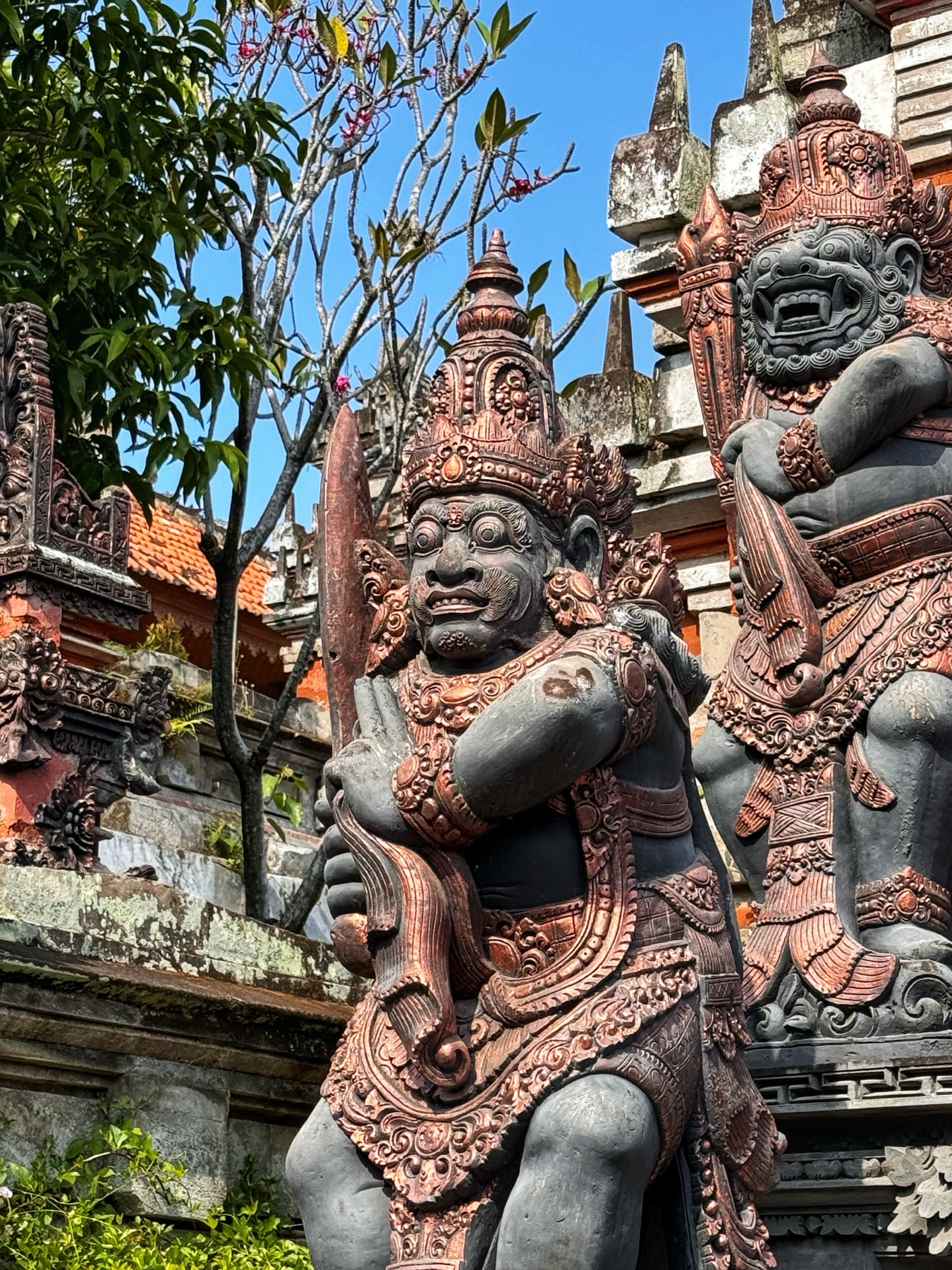 So hatte Ivan wieder eine fantastische Lösung. Er fuhr uns zu einem wunderschönen, buddhistischen Tempel, wo wir fast ganz alleine waren. Ein traumhaftes Fleckchen Erde mit tollen buddhistischen Statuen kombiniert mit hinduistischen Elementen, eingebettet in einen wunderschönen Blumengarten. Wir waren absolut begeistert und zum Schluss bekamen wir auch noch unser Foto am Himmelstor, denn die Tempel in Bali haben in der Regel alle ein solches Tor. Wenn wir es euch nicht verraten hätten, wäre es niemandem aufgefallen, oder?😂