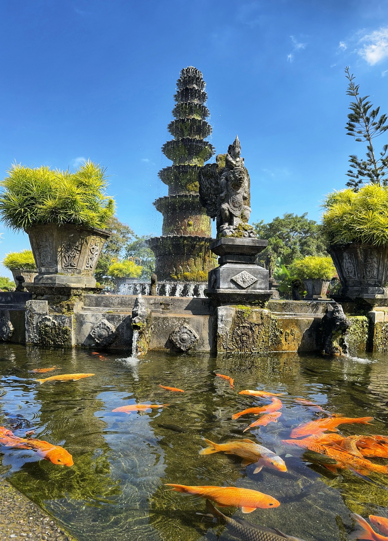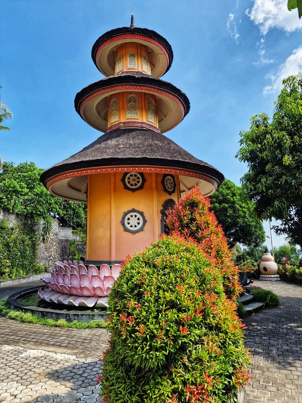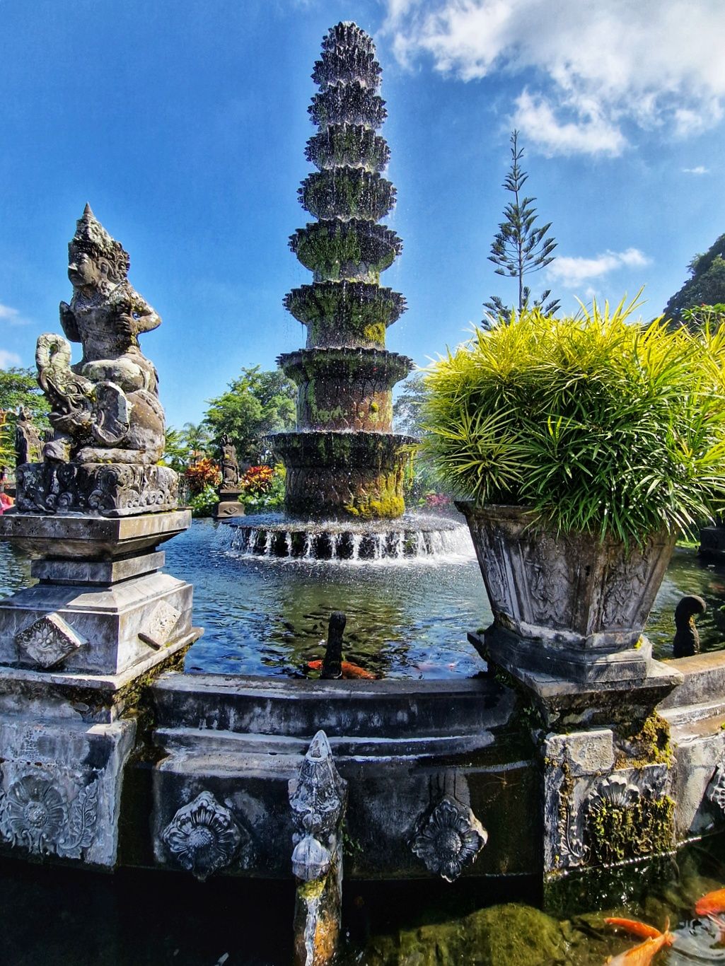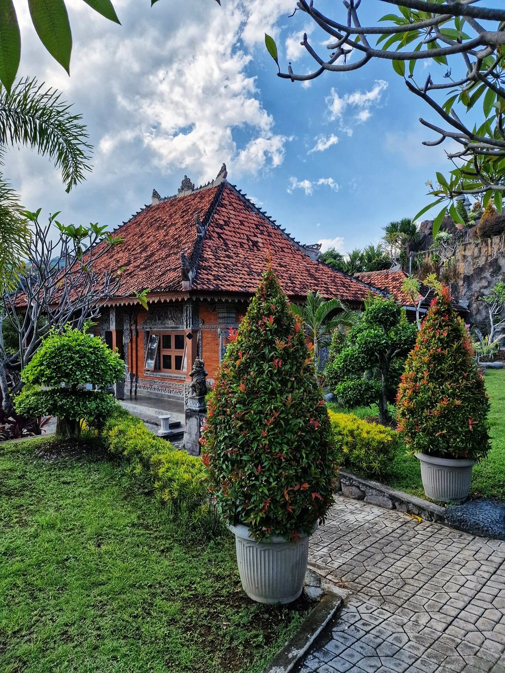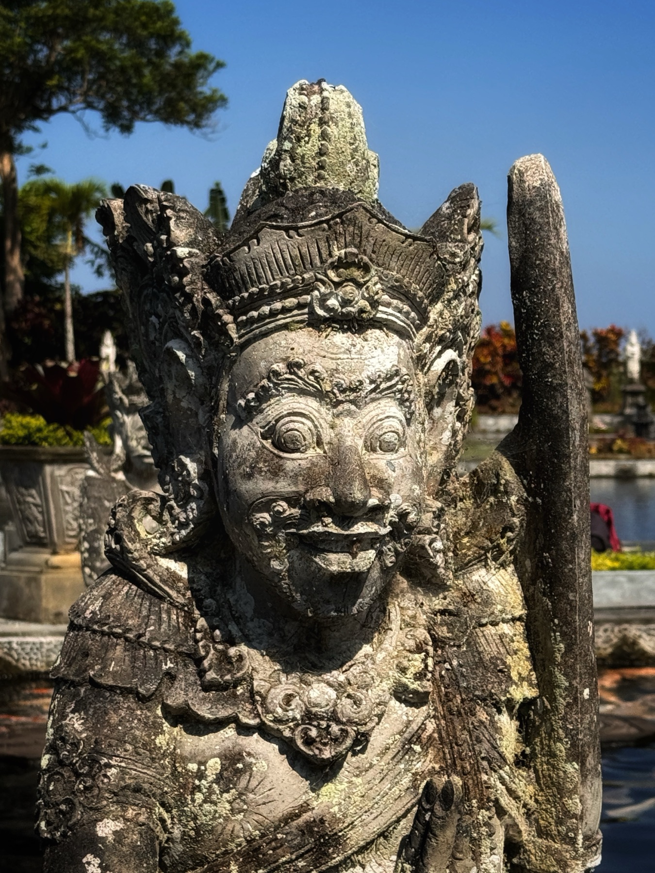 So hatte Ivan wieder eine fantastische Lösung. Er fuhr uns zu einem wunderschönen, buddhistischen Tempel, wo wir fast ganz alleine waren. Ein traumhaftes Fleckchen Erde mit tollen buddhistischen Statuen kombiniert mit hinduistischen Elementen, eingebettet in einen wunderschönen Blumengarten. Wir waren absolut begeistert und zum Schluss bekamen wir auch noch unser Foto am Himmelstor, denn die Tempel in Bali haben in der Regel alle ein solches Tor. Wenn wir es euch nicht verraten hätten, wäre es niemandem aufgefallen, oder?😂