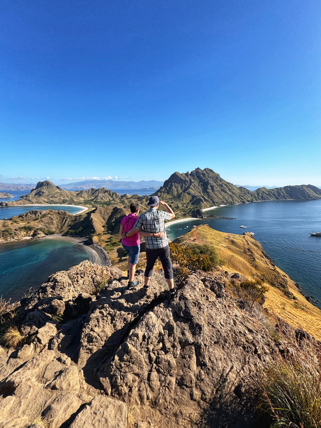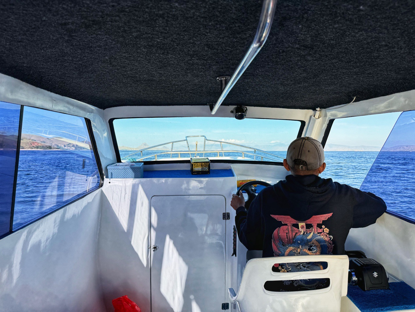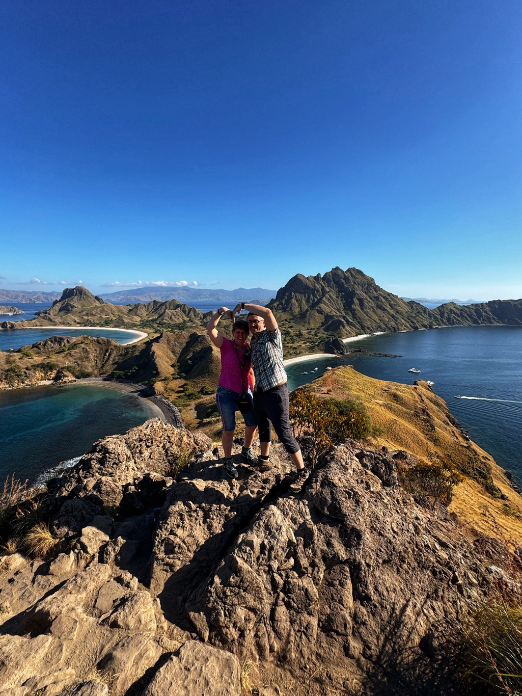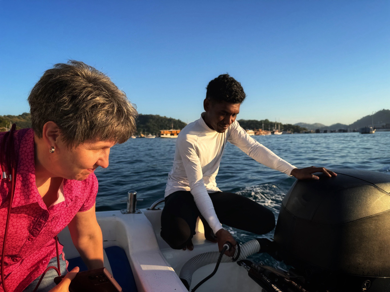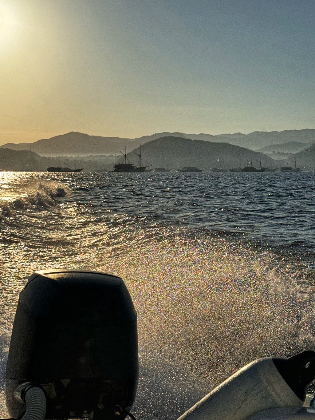Er brachte uns zunächst zum Hafen, wo wir auf ein Boot umstiegen, um zur Insel Padar zu fahren. Die Fahrt dauerte ungefähr 90Min. Auf der Fahrt konnten wir unendlich viele kleine Inseln sehen. Herrliche Ausblicke über das blaue Meer. Mit vollem Speed ging es über das Wasser, da spritze die Gicht manches Mal ordentlich hoch.