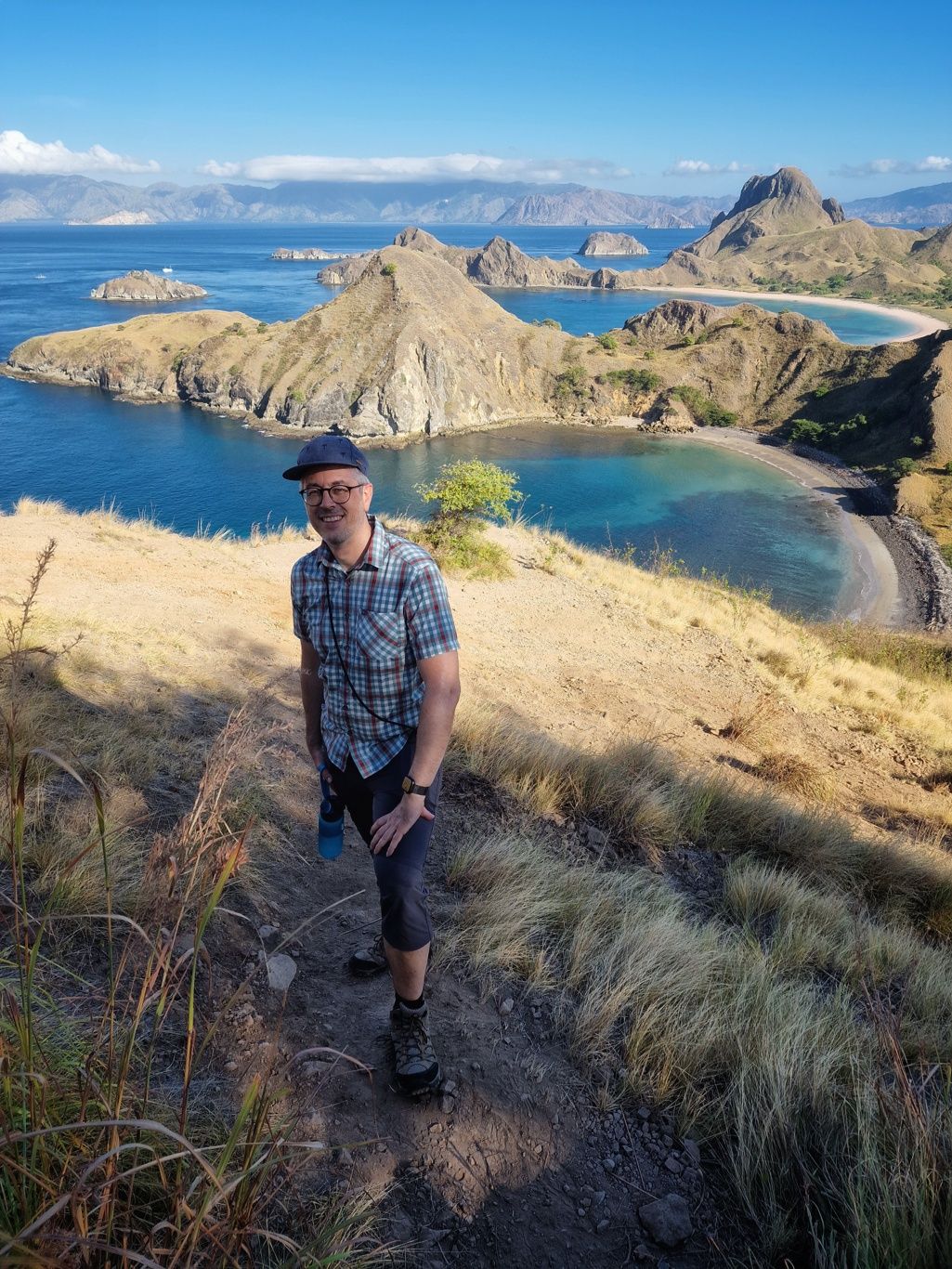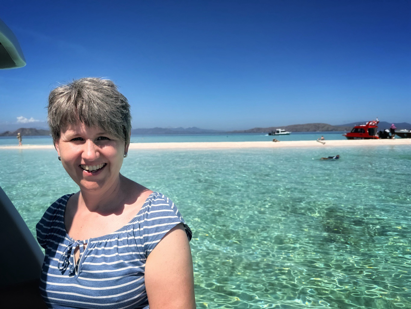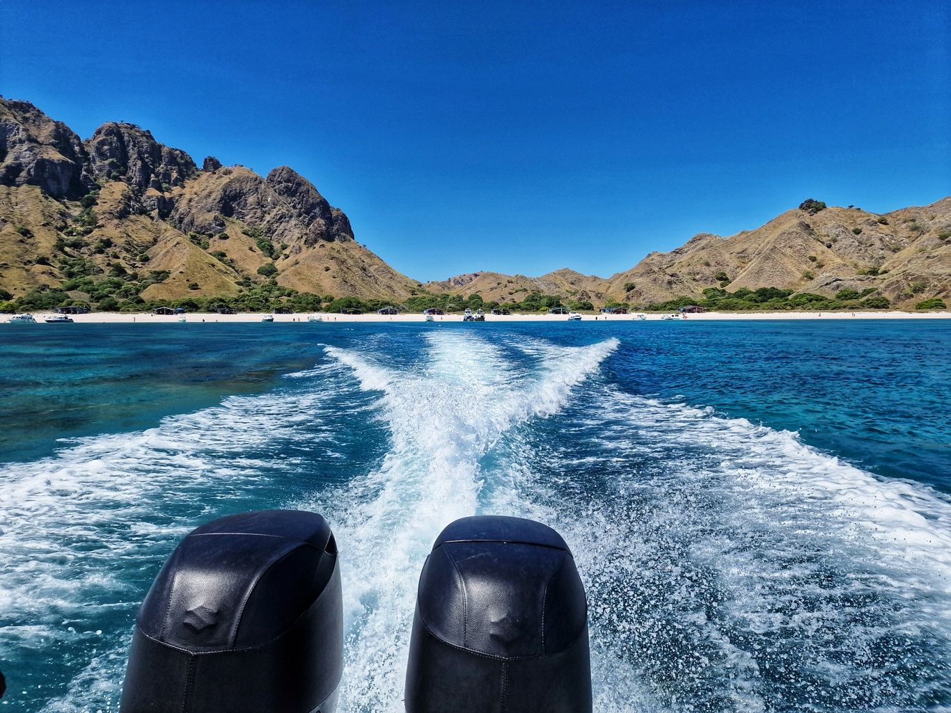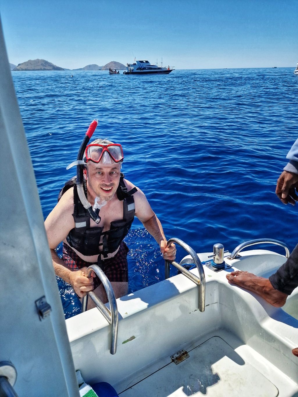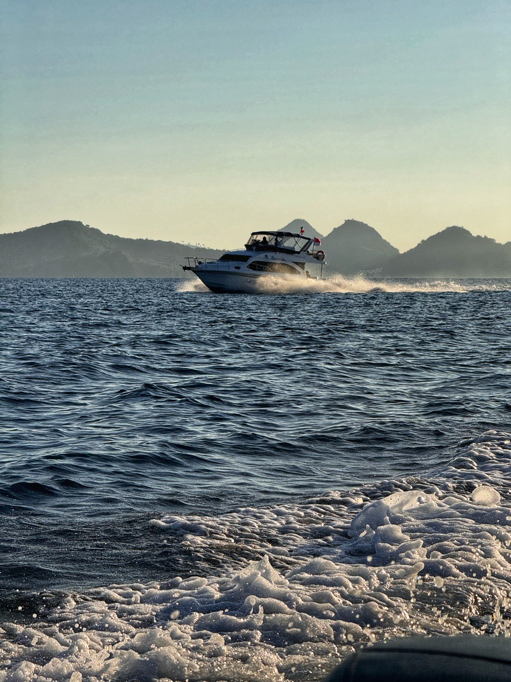 Er brachte uns zunächst zum Hafen, wo wir auf ein Boot umstiegen, um zur Insel Padar zu fahren. Die Fahrt dauerte ungefähr 90Min. Auf der Fahrt konnten wir unendlich viele kleine Inseln sehen. Herrliche Ausblicke über das blaue Meer. Mit vollem Speed ging es über das Wasser, da spritze die Gicht manches Mal ordentlich hoch.