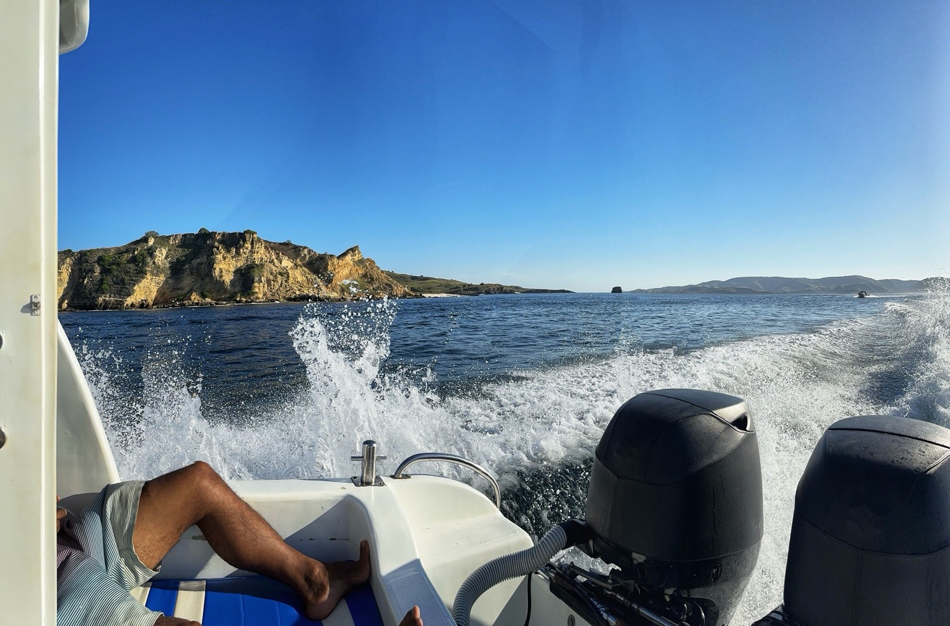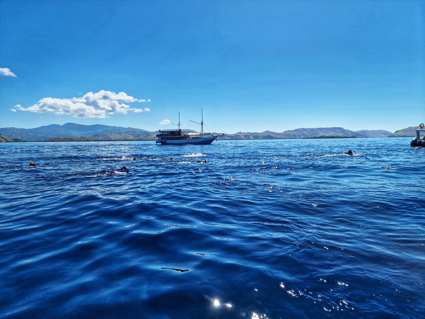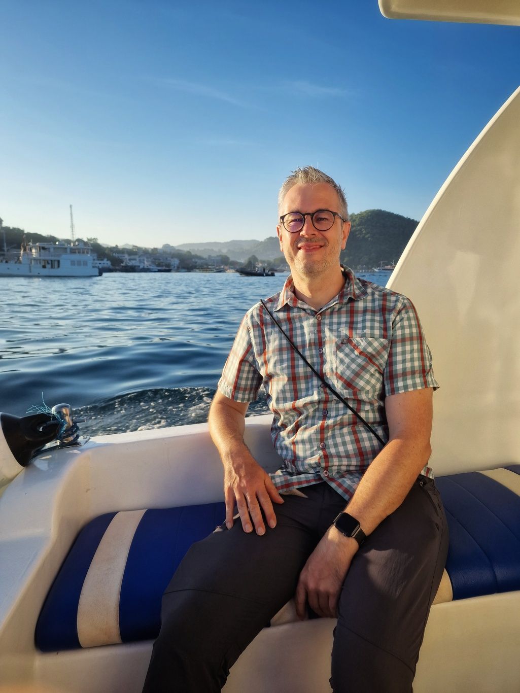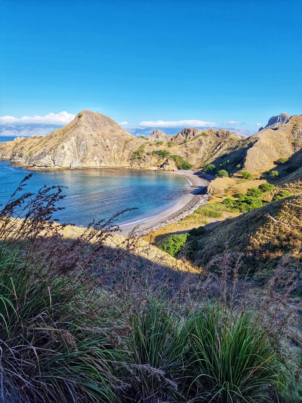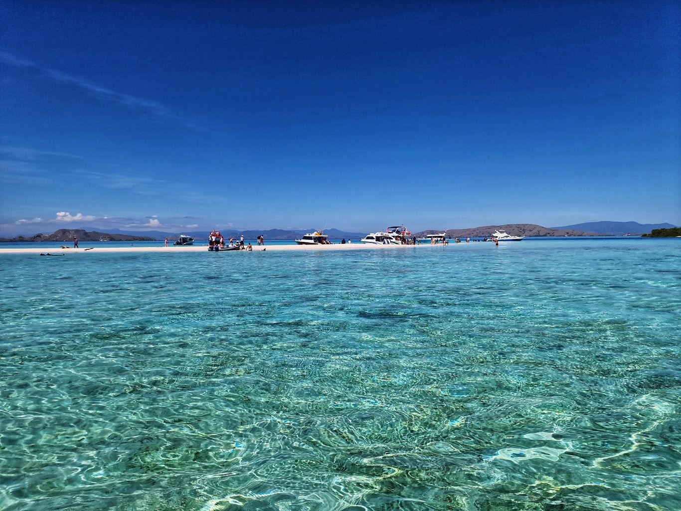 Er brachte uns zunächst zum Hafen, wo wir auf ein Boot umstiegen, um zur Insel Padar zu fahren. Die Fahrt dauerte ungefähr 90Min. Auf der Fahrt konnten wir unendlich viele kleine Inseln sehen. Herrliche Ausblicke über das blaue Meer. Mit vollem Speed ging es über das Wasser, da spritze die Gicht manches Mal ordentlich hoch.