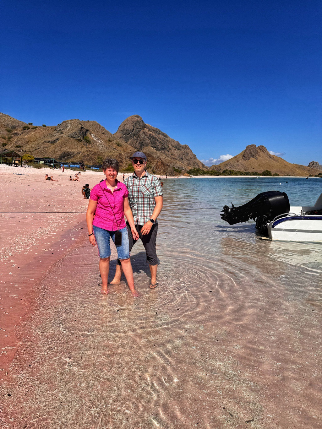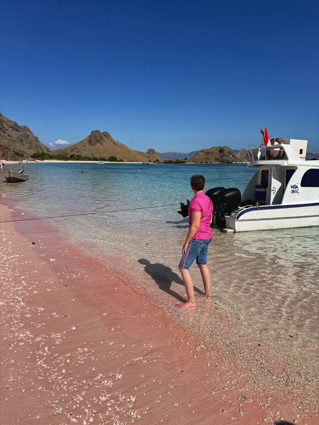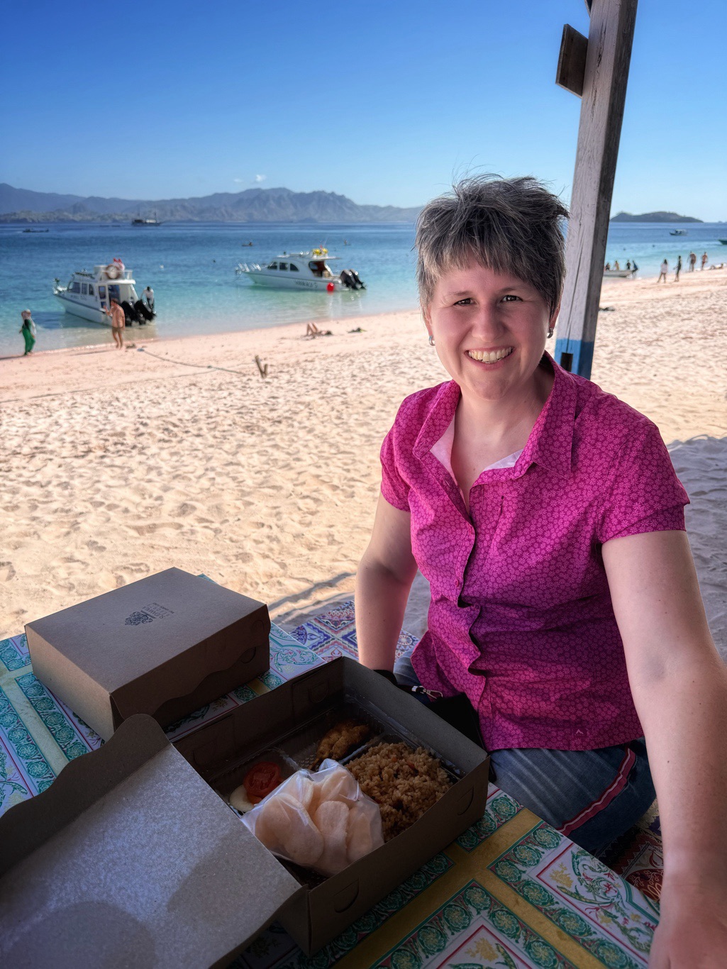 Zurück zum Boot brachte man uns zum Pink Beach, ein Strand mit tatsächlich rosafarbenem Sand. Die Farbe entsteht durch rote Korallen, die dort zerfallen sind. Ein spektakulärer Anblick. Hier nahmen wir zuerst unser mitgebrachtes Frühstück ein und schwammen danach noch eine Runde im glasklaren Wasser.
