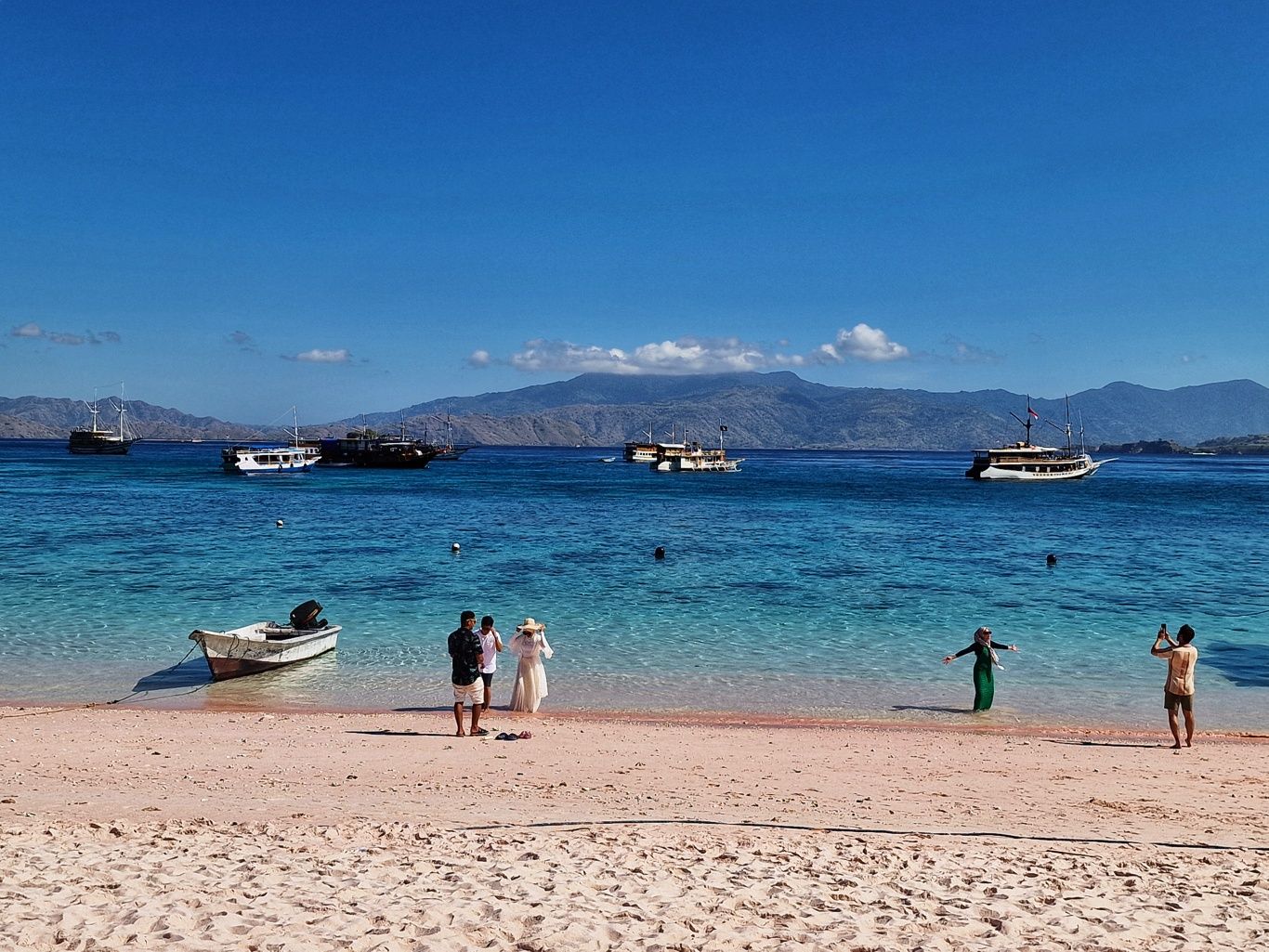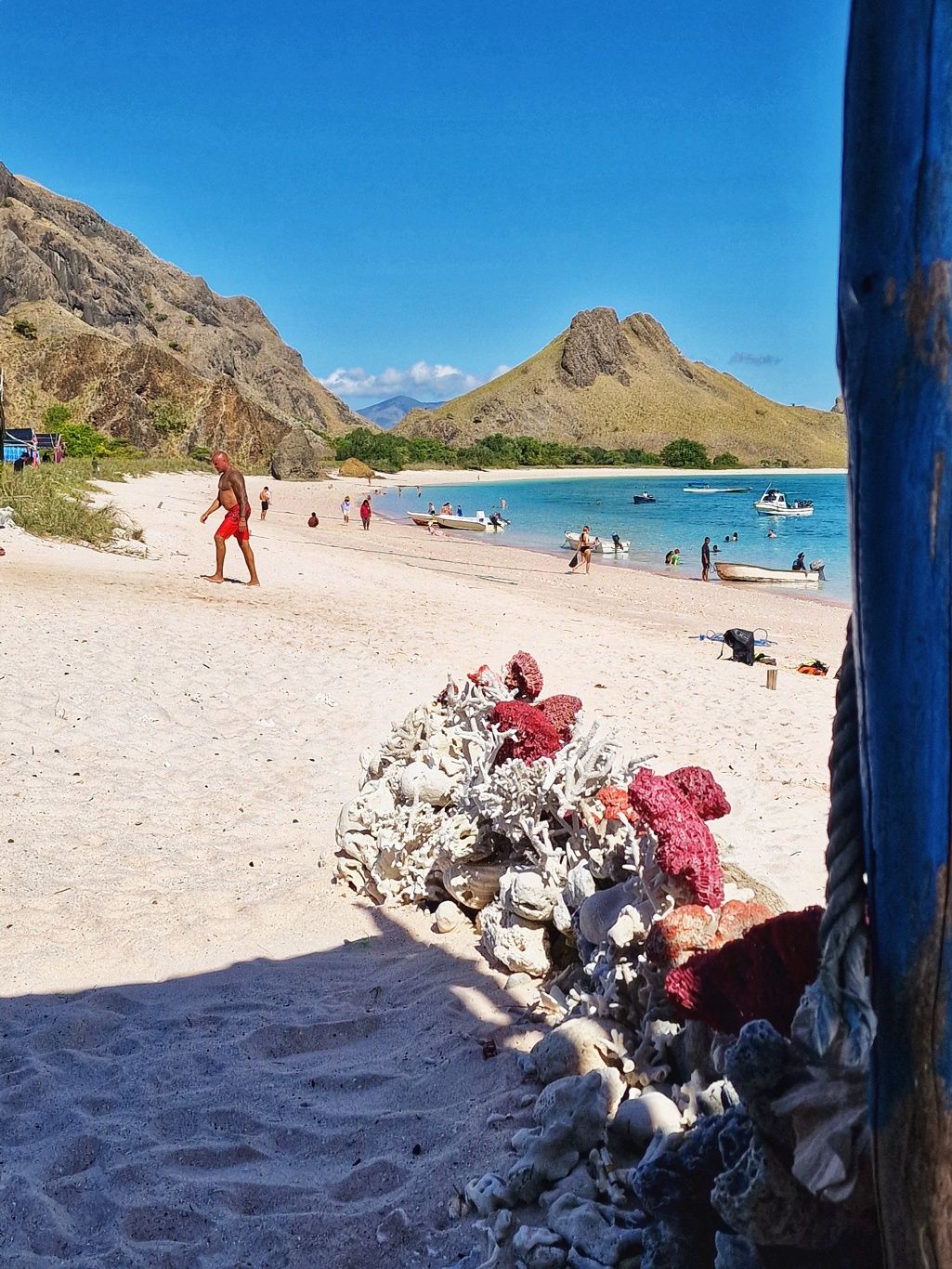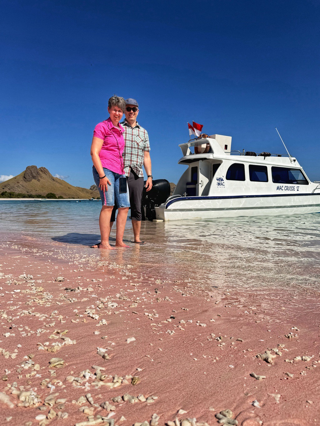 Zurück zum Boot brachte man uns zum Pink Beach, ein Strand mit tatsächlich rosafarbenem Sand. Die Farbe entsteht durch rote Korallen, die dort zerfallen sind. Ein spektakulärer Anblick. Hier nahmen wir zuerst unser mitgebrachtes Frühstück ein und schwammen danach noch eine Runde im glasklaren Wasser.