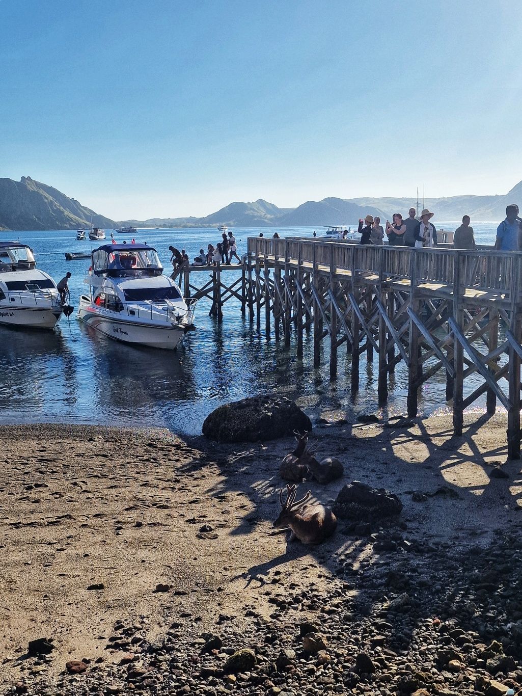 Weiter ging es zur Insel Komodo, wo die gleichnamigen Komodowarane beheimatet sind. Die Insel ist mittlerweile ein Nationalpark. Hier leben über 1500 dieser Riesenechsen, die bis zu 70kg schwer und drei Meter lang werden können. Bei einem Spaziergang mit einem lokalen Ranger sahen wir tatsächlich drei dieser gigantisch großen Tiere.